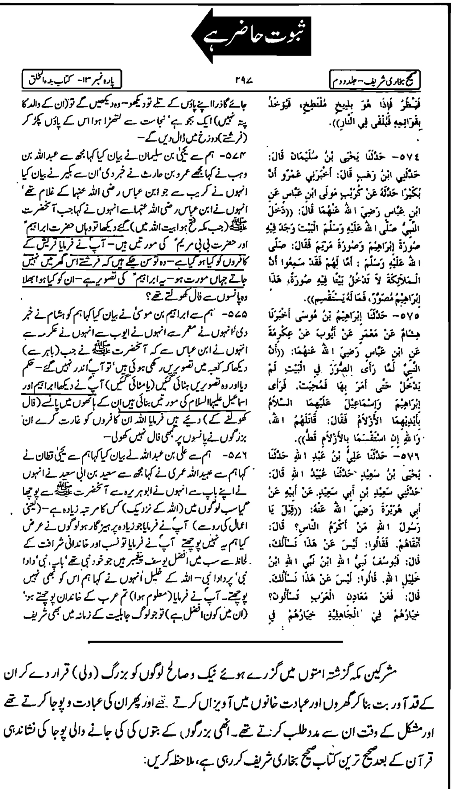 اس کے علاوہ یہ بھی یادر ہے کہ بخاری شریف میں درج ہے کہ قوم نوح اور مکہ کے مشرک جن بتوں کی پوجا کرتے تھے وہ بزرگوں اور نبیوں کے تھے، وہ لوگ محض اتنے بھی پاگل نہ تھے کہ پتھروں کے بت بنا کر ان کی پوجا کرتے بلکہ بزرگوں اور نبیوں کے بت بناتے تھے۔ اور یہ کہ خانہ کعبہ میں ابراہیم علیہ السلام اور اسماعیل علیہ السلام کے بت تھے۔ [بخاری، کتاب الحج، باب من كبر في نواحي الكعبة:4288،1601]
