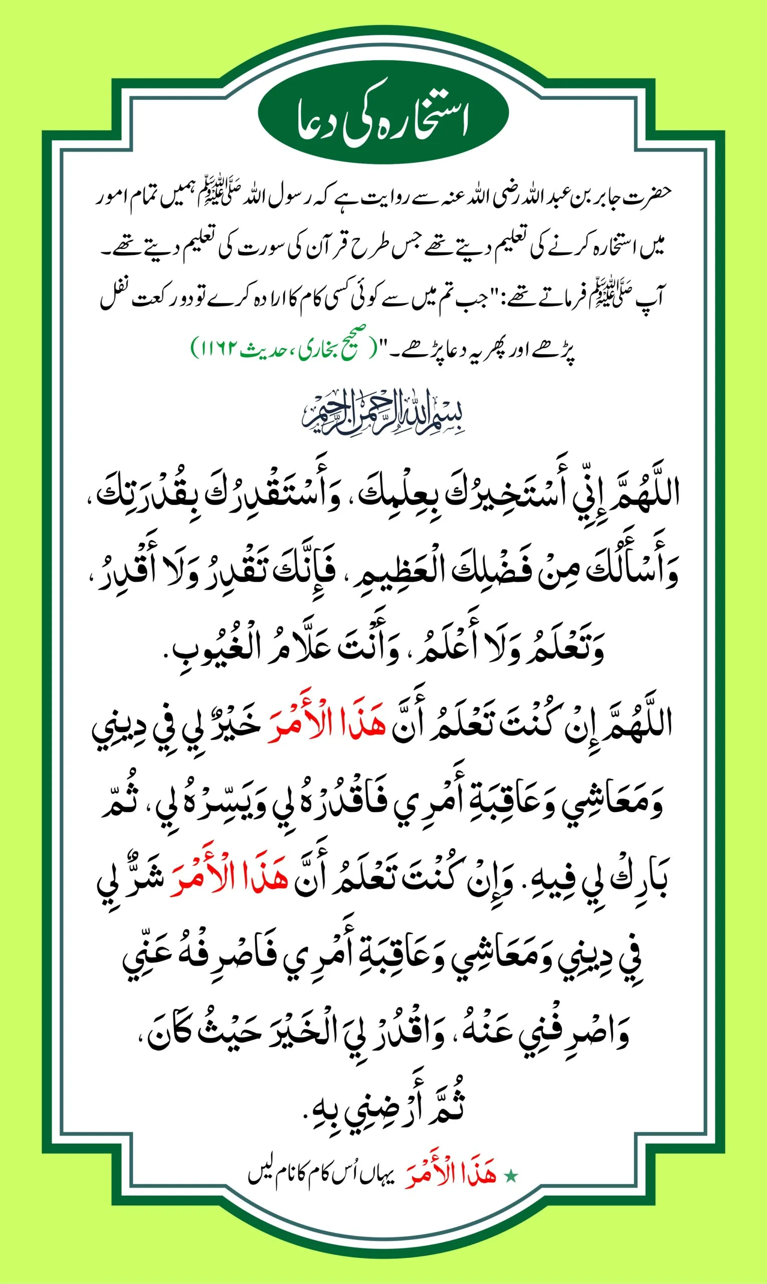 اے اللہ! بے شک میں تجھ سے تیرے علم کے ساتھ بھلائی طلب کرتا ہوں اور تجھ سے تیری قدرت کے ساتھ طاقت طلب کرتا ہوں اور میں تجھ سے تیرے فضلِ عظیم کا سوال کرتا ہوں کیونکہ تو قدرت رکھتا ہے اور میں قدرت نہیں رکھتا، تو جانتا ہے اور میں نہیں جانتا اور تو غیبوں کو خوب جانتا ہے۔ اے اللہ! اگر تو جانتا ہے کہ بے شک یہ کام میرے لیے میرے دین، میرے معاش اور میرے انجام کار کے لحاظ سے بہتر ہے تو اس کا میرے حق میں فیصلہ کردے اور اسے میرے لیے آسان کردے، پھر میرے لیے اس میں برکت ڈال دے اور اگر تو جانتا ہے کہ بے شک یہ کام میرے لیے میرے دین، میرے معاش اور میرے انجامِ کار کے لحاظ سے بُرا ہے تو اسے مجھ سے دور کردے اور مجھے اس سے دور کردے اور میرے لیے بھلائی کا فیصلہ کردے جہاں بھی وہ ہو، پھر مجھے اس پر راضی کردے۔‘‘