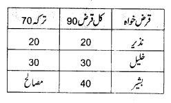 کل قرض میں سے بشیر کا قرضہ ”40 “روپے نکال دیے تو قرضہ ”50 “روپے باقی رہ گیا۔ اس کو ترکہ سے نکالا تو ”20 “روپے باقی رہ گئے جو ورثاء میں حصص کے مطابق تقسیم کر دیے جائیں گے۔