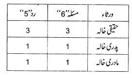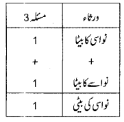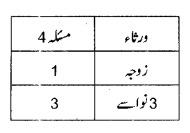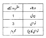 ⑤ جس کو میت سے دو قرابتیں حاصل ہوں وہ دونوں کی وجہ سے وارث بنے گا۔ مثلاً میت ذوالارحام وارث چھوڑ کر فوت ہوئی کہ ایک نواسی کا بیٹا اور وہی نواسے کا بیٹا بھی ہے اور دوسری صرف نواسی کی بیٹی ہے: