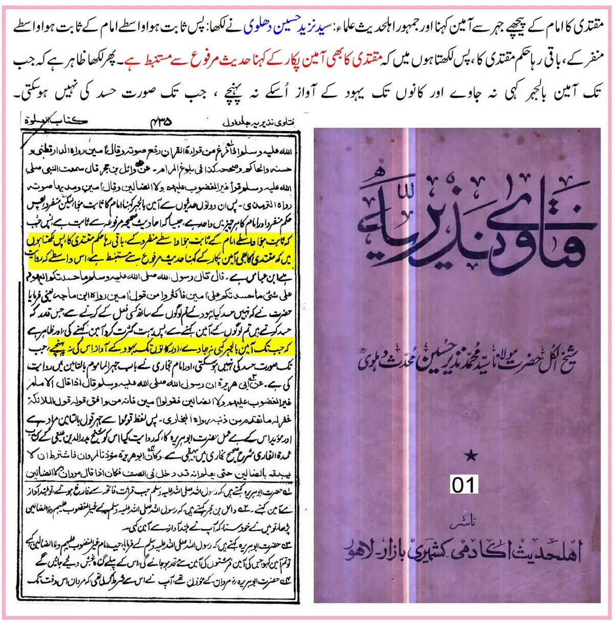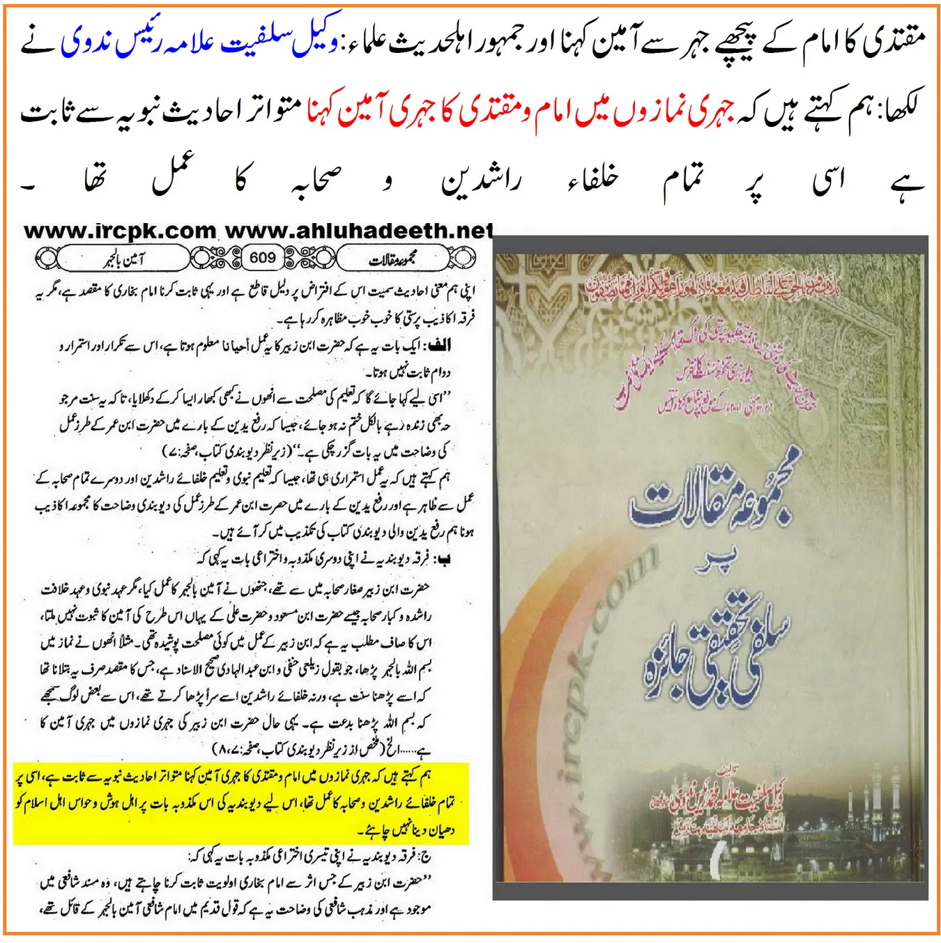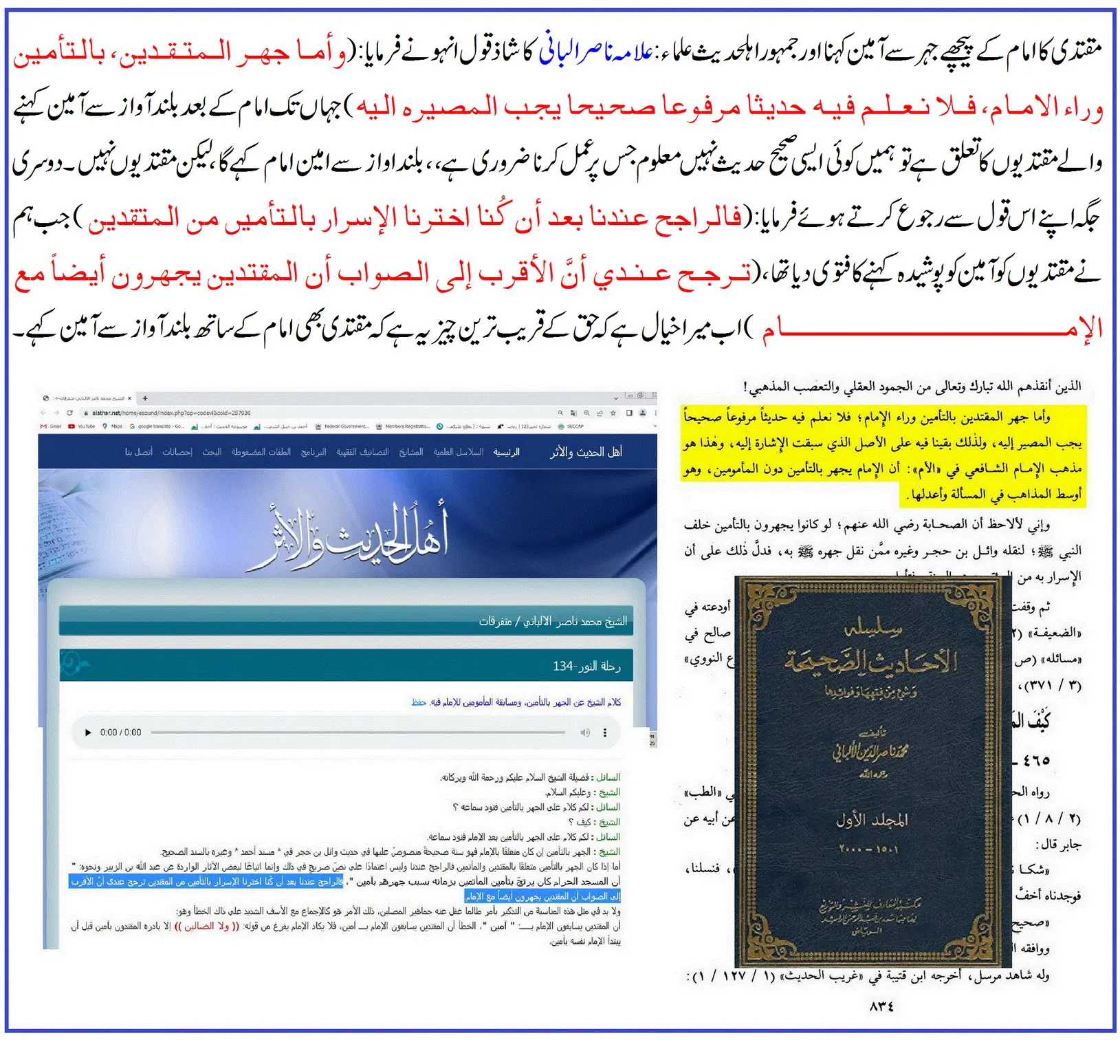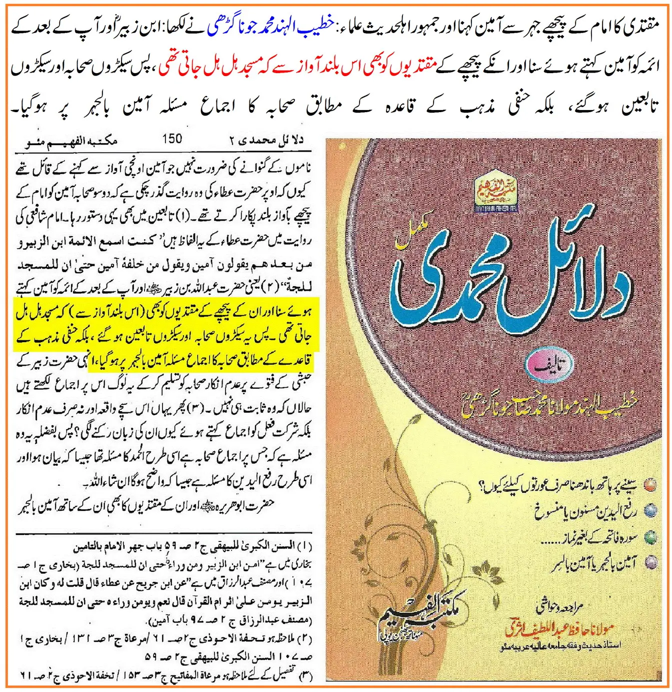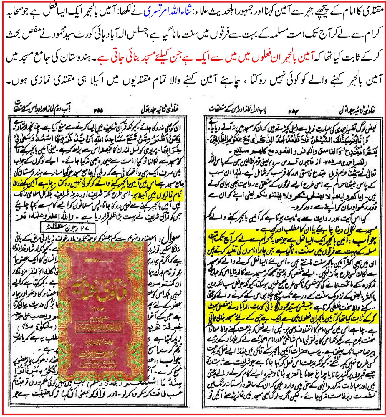 "آمین بالجہر ایسا فعل ہے جو صحابہ کرامؓ سے لے کر آج تک امت کے بہت سے فرقوں میں سنت مانا گیا۔ ہندوستان میں جامع مسجد میں مقتدی آمین بالجہر کہتے ہیں اور کوئی نہیں روکتا، چاہے مقتدی اکیلا ہی کیوں نہ ہو۔”