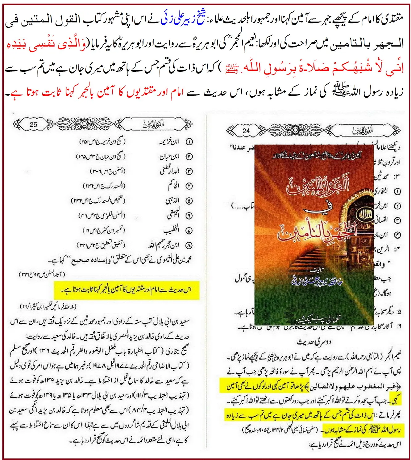 "ابوہریرہؓ کا یہ فرمان: والذي نفسي بيده إني لأشبهكم صلاة برسول الله ﷺ (بخاری) اس بات کی دلیل ہے کہ امام اور مقتدی سب آمین بالجہر کہتے تھے۔”