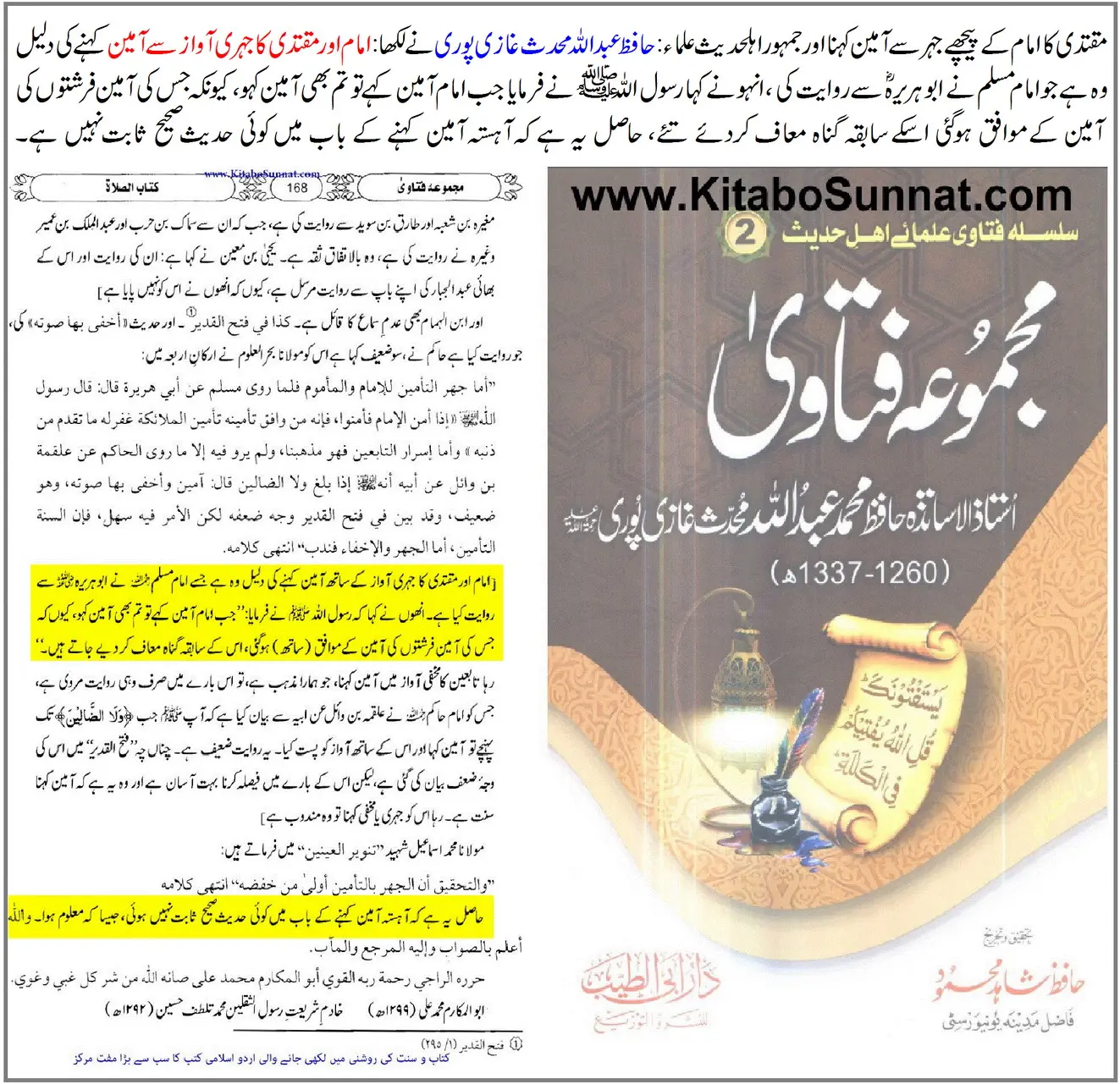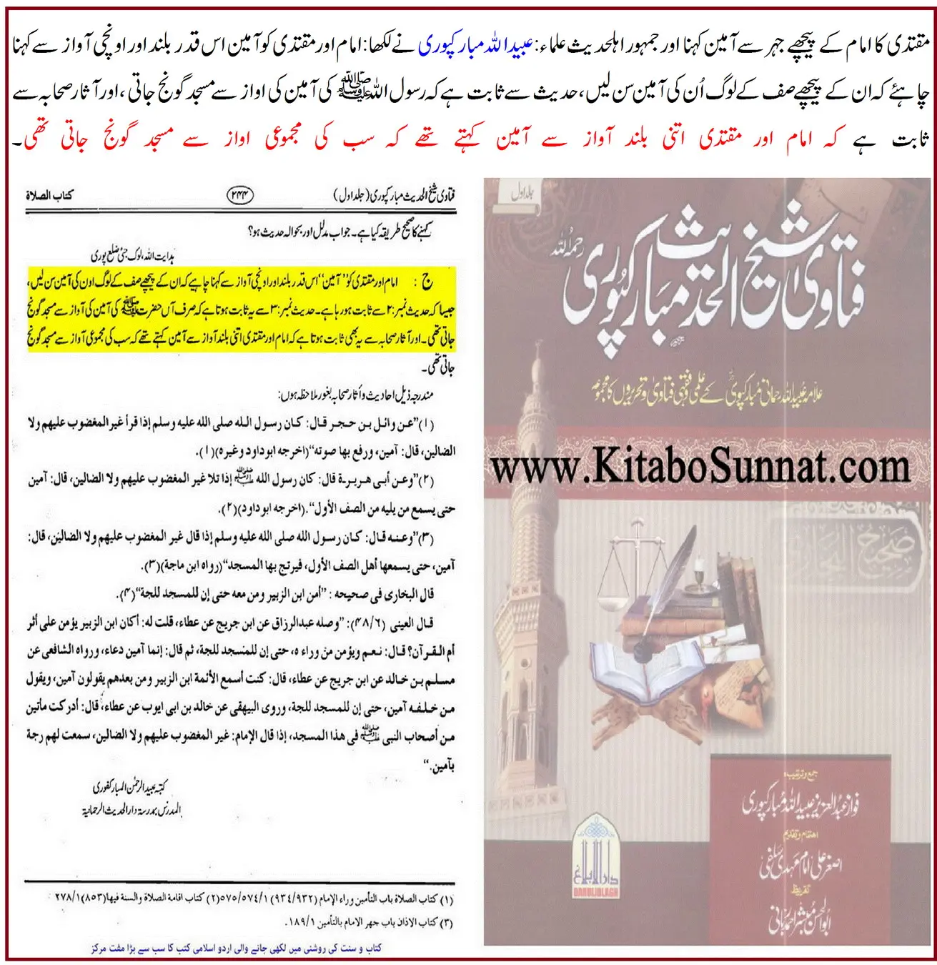 "ہم کہتے ہیں کہ جہری نمازوں میں امام و مقتدی کا آمین بالجہر کرنا متواتر احادیث سے ثابت ہے، اور تمام خلفاء راشدین و صحابہ کا اسی پر عمل تھا۔”