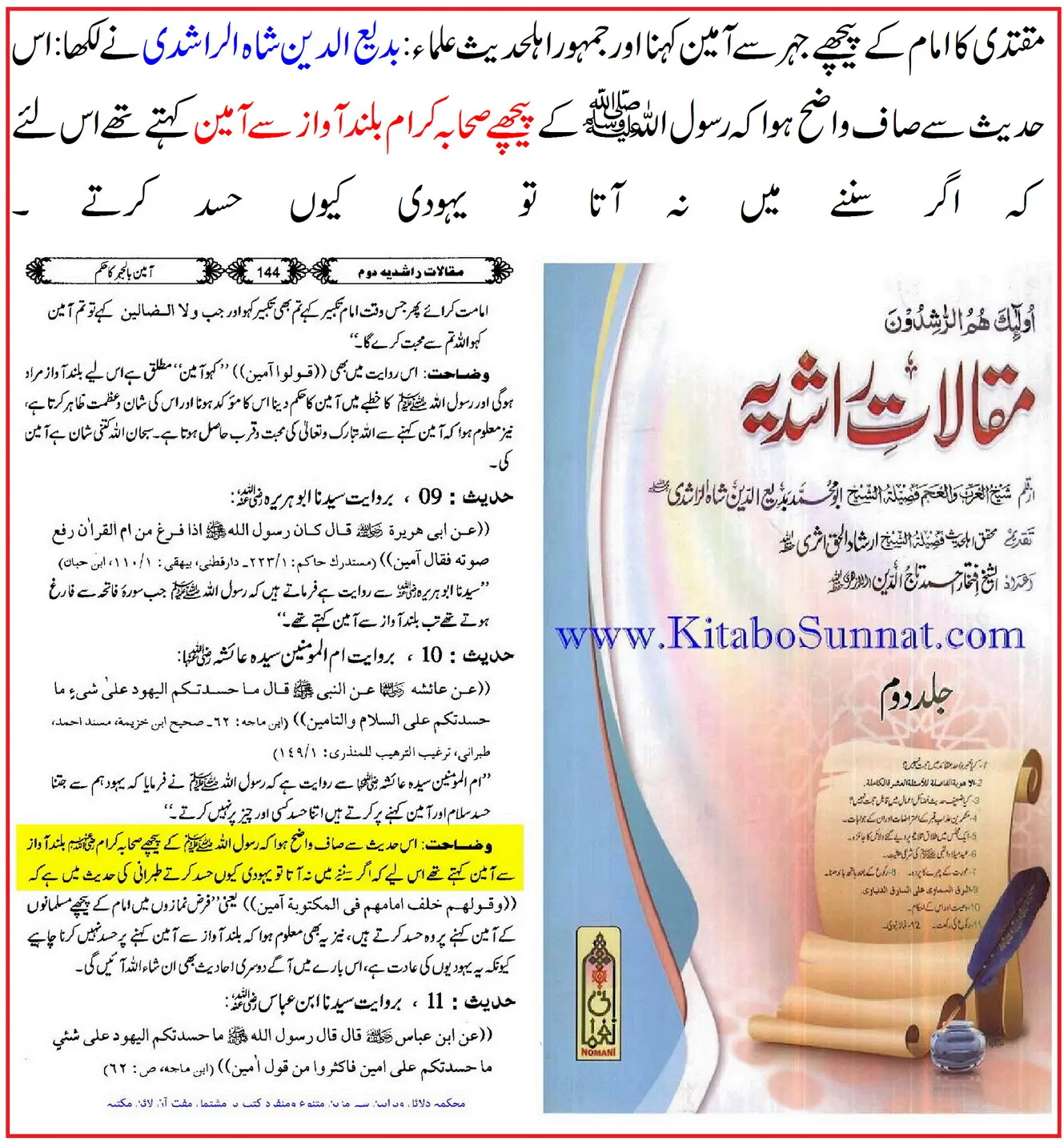 "حدیث سے صاف ظاہر ہے کہ صحابہ کرامؓ رسول اللہ ﷺ کے پیچھے آمین بالجہر کہتے تھے، اور اگر یہ جہری نہ ہوتی تو یہودی حسد کیوں کرتے؟”
