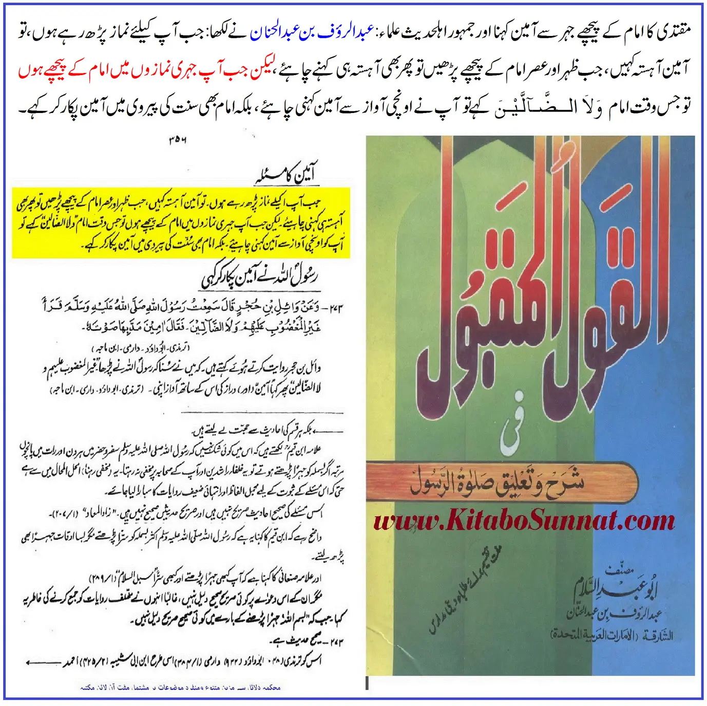 • عبدالرؤف بن عبدالحنانؒ: جہری نمازوں میں مقتدی بھی امام کے ساتھ آمین بالجہر کہے، یہی سنت ہے۔ (القول المقبول، ص 356)