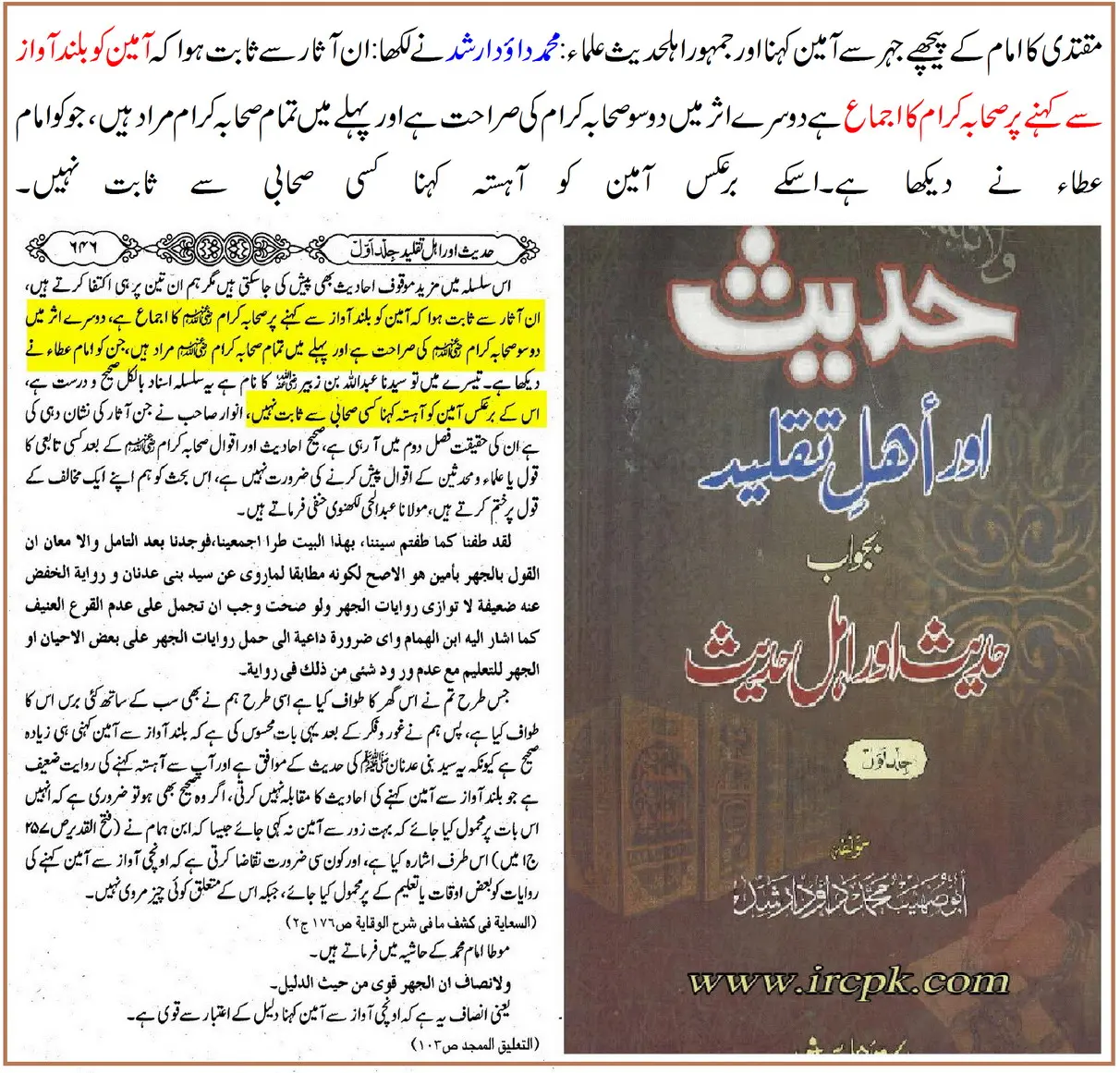 • محمد داؤد ارشدؒ: "آمین بالجہر پر صحابہ کرامؓ کا اجماع ہے، اور کسی صحابی سے آمین خفیہ کہنا ثابت نہیں۔”