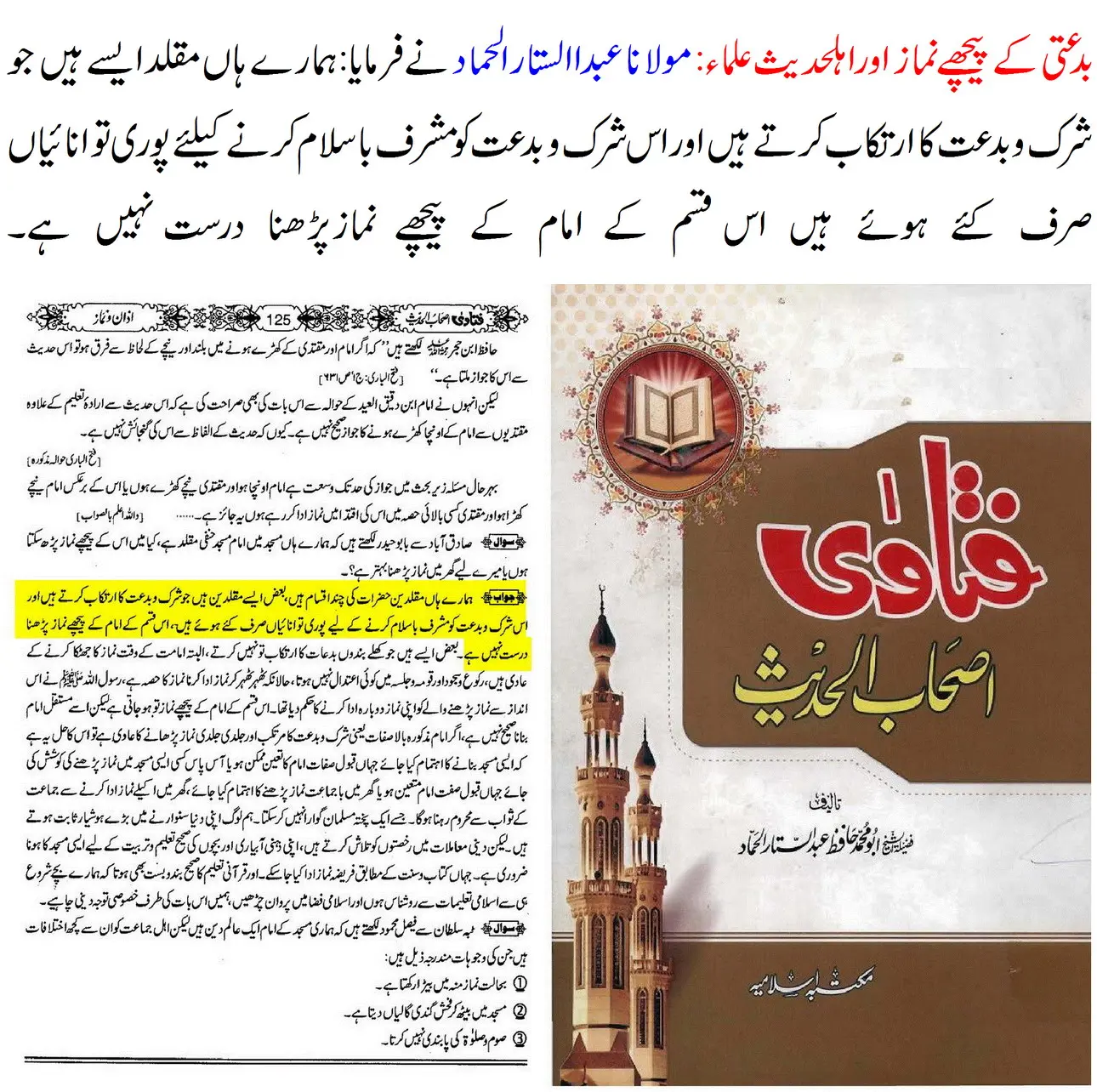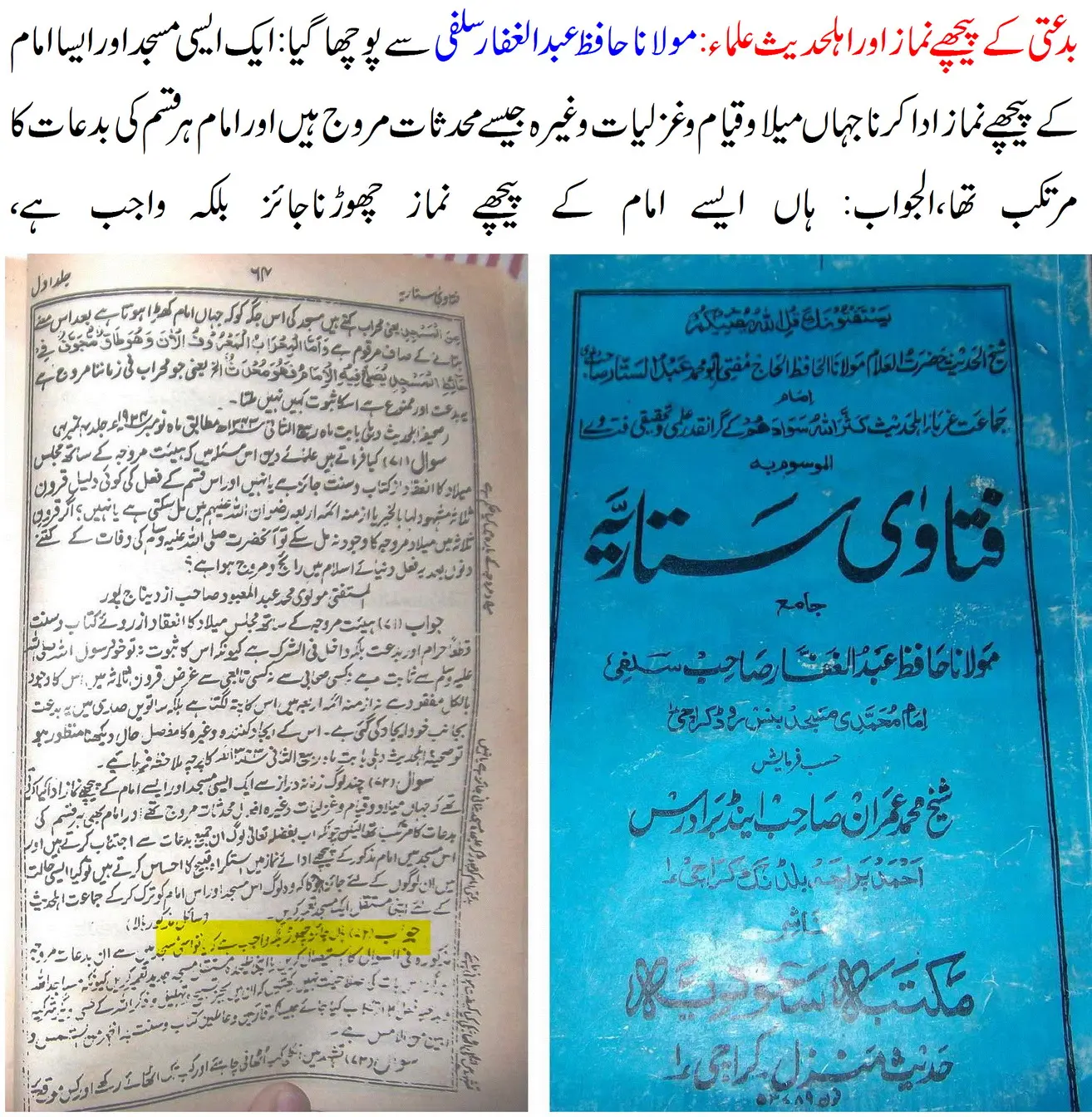 “ایک ایسے امام کے پیچھے نماز ادا کرنا جائز نہیں جو میلاد، قیام، غزل خوانی اور دیگر بدعات میں مبتلا ہو۔ ایسے امام کے پیچھے نماز چھوڑنا جائز نہیں بلکہ واجب ہے۔”