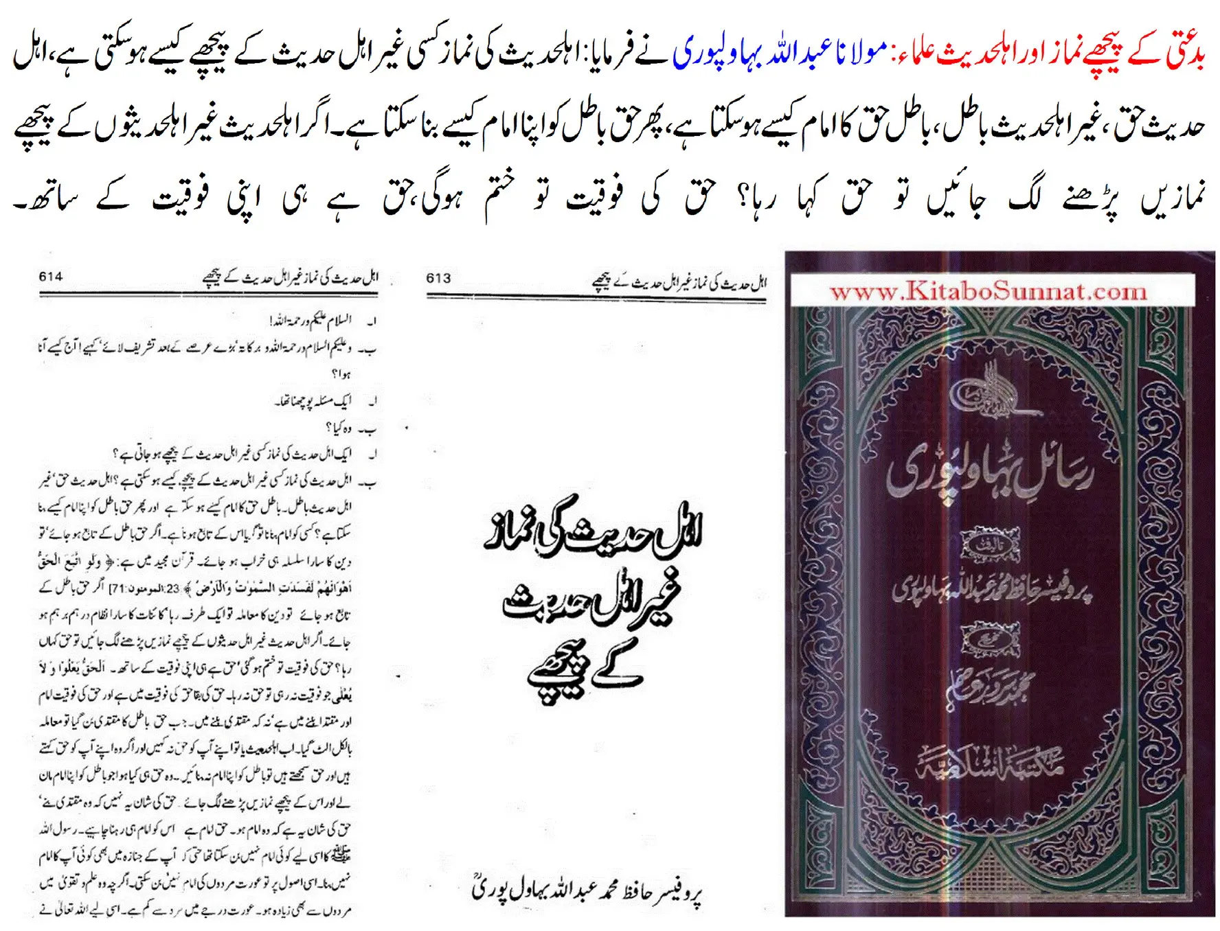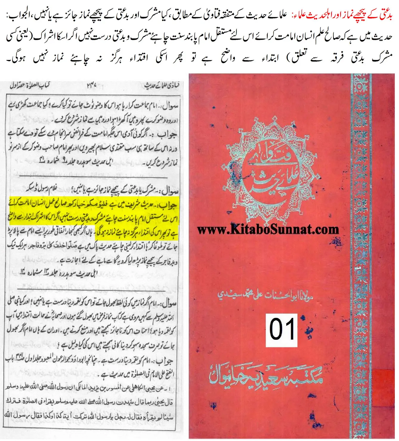 “اصحابِ حدیث اہلِ بدعت کے پیچھے نماز نہیں دیکھتے تاکہ عام لوگ اسے (بطورِ سنت) دیکھ کر بگاڑ میں مبتلا نہ ہوں۔”