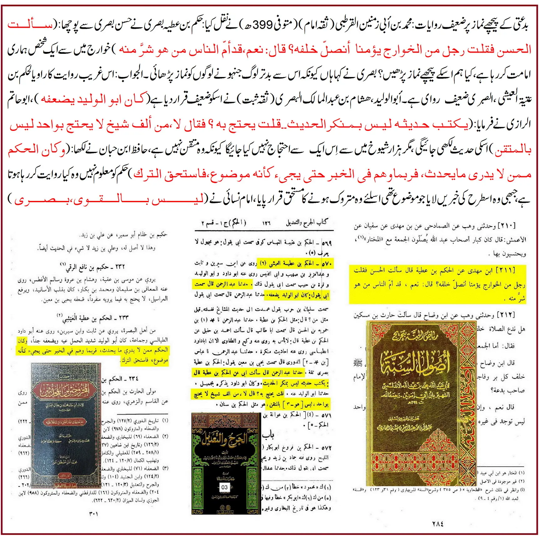 “پانچوں نمازیں اس کے پیچھے درست ہیں جس کے پیچھے تم نے پڑھی ہوں سوائے اس کے جو جہمی ہو؛ … تو اپنی نماز دوبارہ ادا کرو۔ اگر جمعہ کا امام جہمی اور سلطان ہو تو اس کے پیچھے پڑھ لو اور اعادہ کرو …”