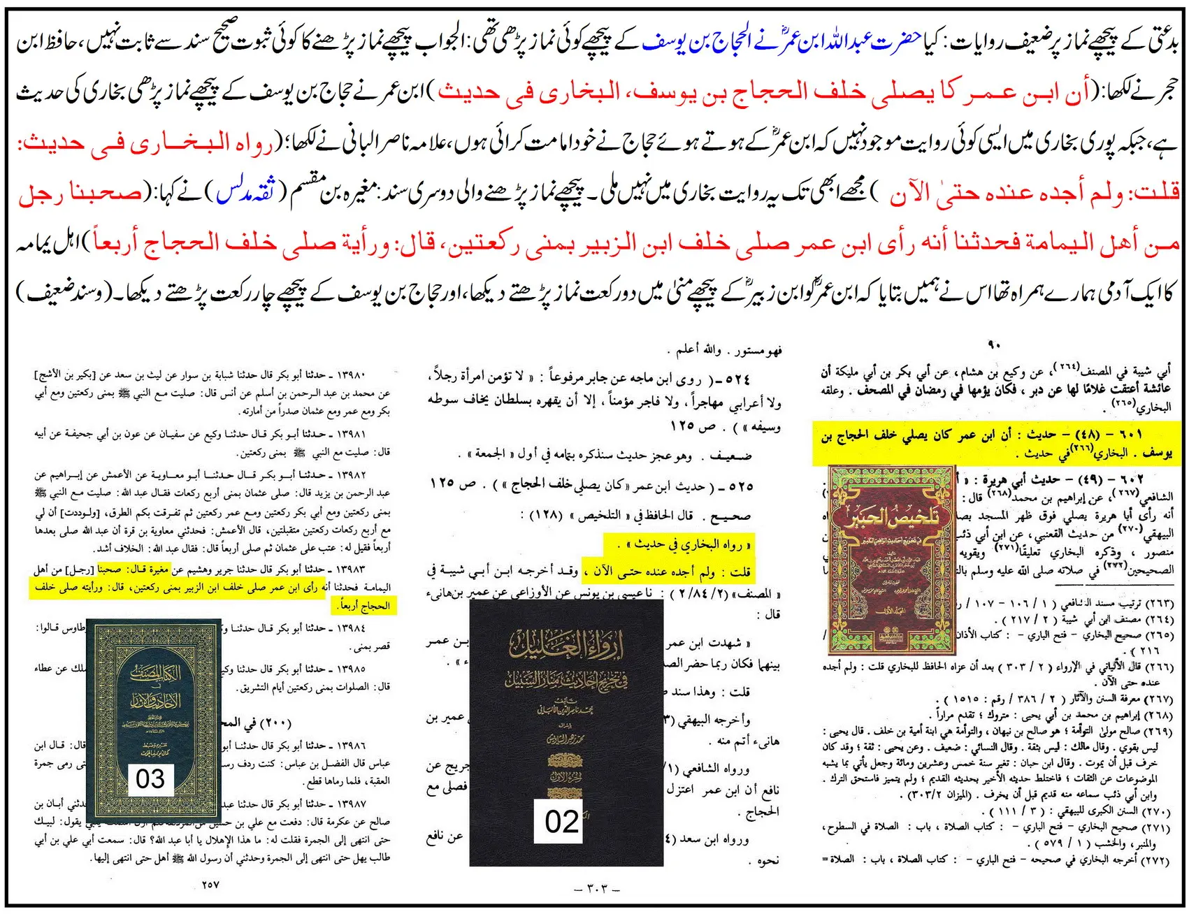 حافظ ابن حجر نے التلخيص الحبير میں ایک نسبت ذکر کی کہ “بخاری میں ابن عمرؓ کا حجاج کے پیچھے نماز پڑھنا آیا ہے”، مگر البانی نے إرواء الغليل میں کہا: “اسے بخاری میں نہیں پایا”۔