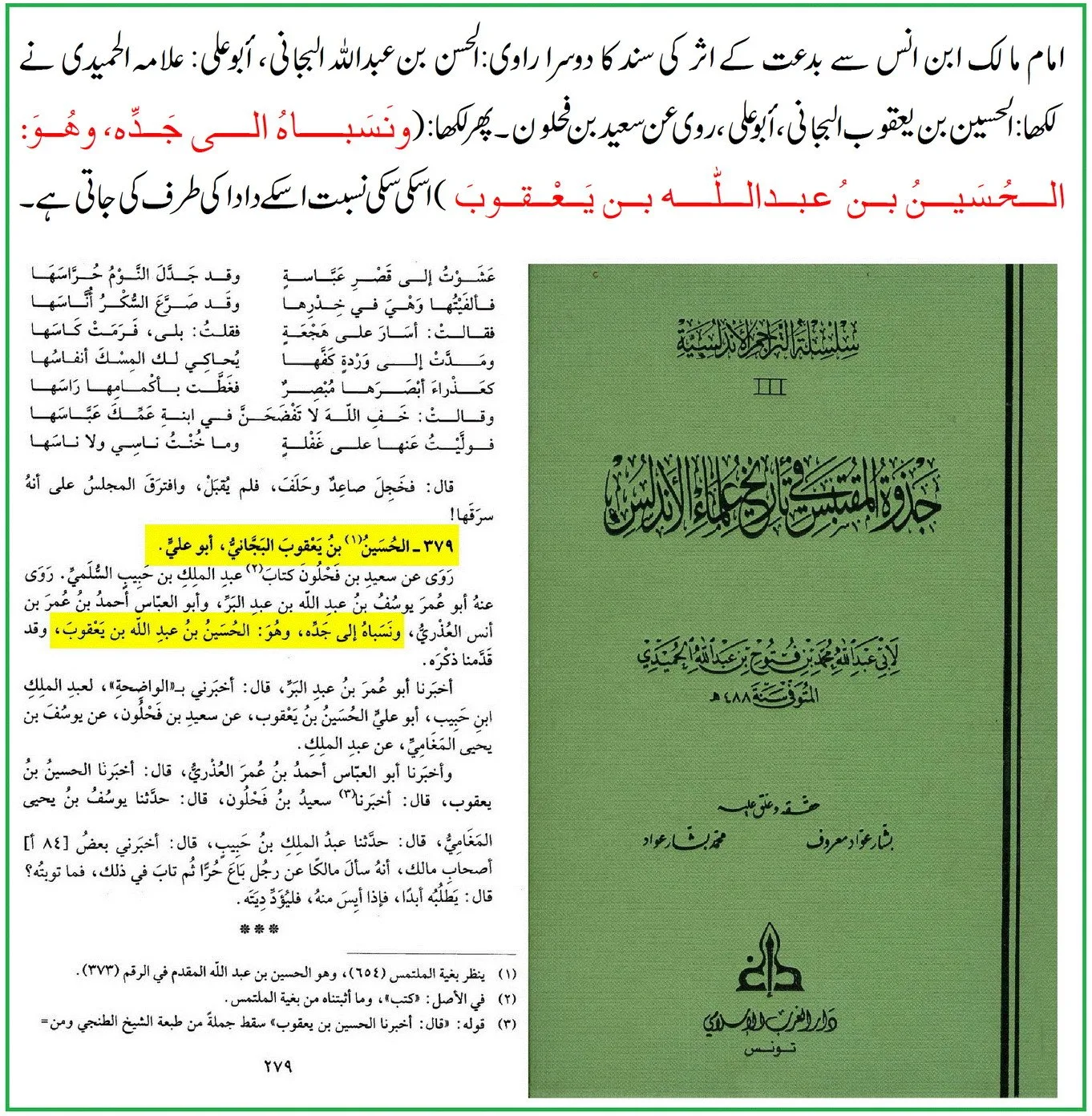 حسین بن یعقوب البجانی ابو علی نے سعید بن فحلون سے عبدالملک بن حبیب السلمی کی کتاب روایت کی… اور اس کی نسبت دادا کی طرف کی جاتی ہے، اور وہ “حسین بن عبد اللہ ابن یعقوب” ہیں۔