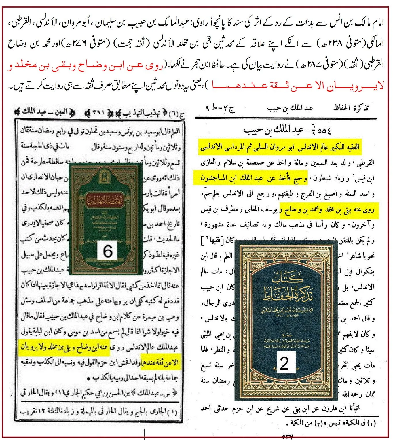 عبدالملک بن حبیب عالمِ اندلس ہیں، ان سے ابن وضاح اور بقی بن مخلد نے روایت کی، اور یہ دونوں اپنے نزدیک صرف ثقہ سے روایت کرتے ہیں۔