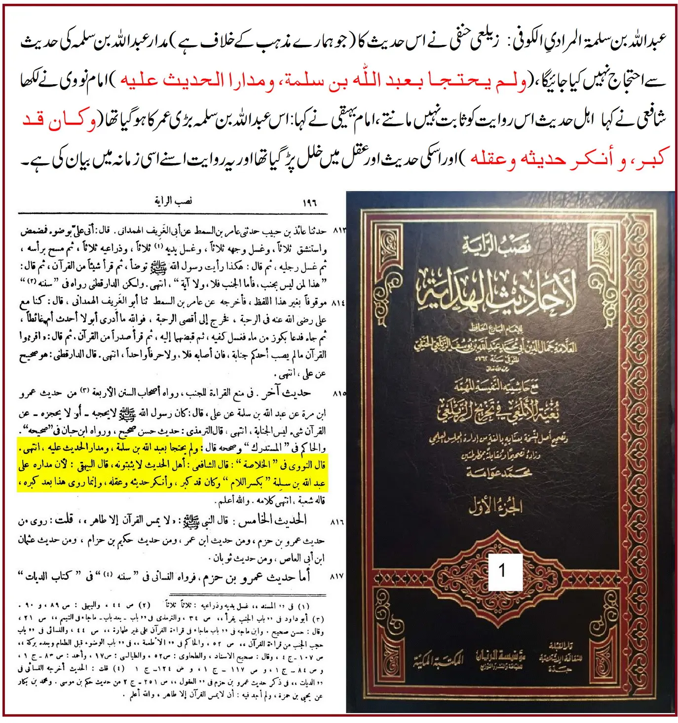 ترجمہ: یہ ساری روایت عبد اللہ بن سلمہ مرادی کوفی پر موقوف ہے۔ امام بیہقی نے فرمایا کہ جب یہ بوڑھے ہوئے تو ان کا حافظہ خراب ہوگیا اور یہ روایت میں کثرت سے غلطیاں کرنے لگے۔