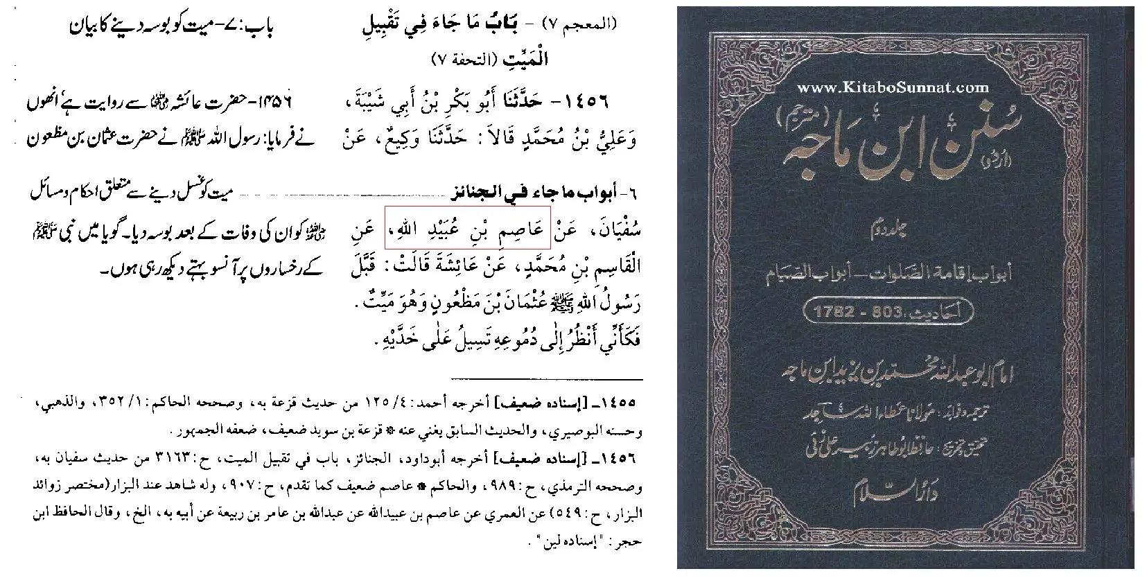 ③ حوالہ: سنن ابن ماجہ، کتاب الجنائز، باب ما جاء فی تقبیل المیت، حدیث نمبر 1456۔ نیز: مسند احمد (ج 6، ص 43)، مستدرک حاکم (ج 3، ص 209، حدیث 4848)، سنن ابوداؤد (ج 3، ص 201، حدیث 3163، دارالفکر بیروت)۔