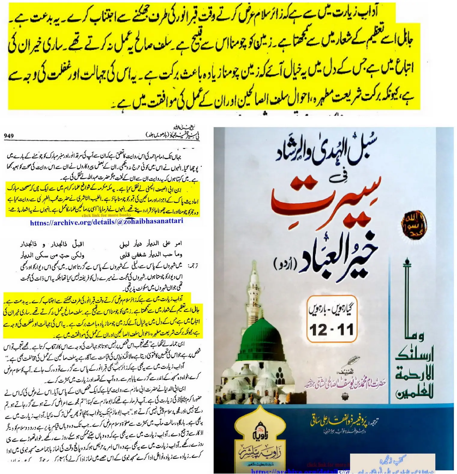 "امام احمد بن حنبل رحمہ اللہ سے روایت ہے کہ ان سے کسی نے پوچھا کہ حضور علیہ السلام کے مزارِ اقدس یا منبر کو بوسہ دینا کیسا ہے؟ تو فرمایا کہ اس میں کوئی حرج نہیں۔”