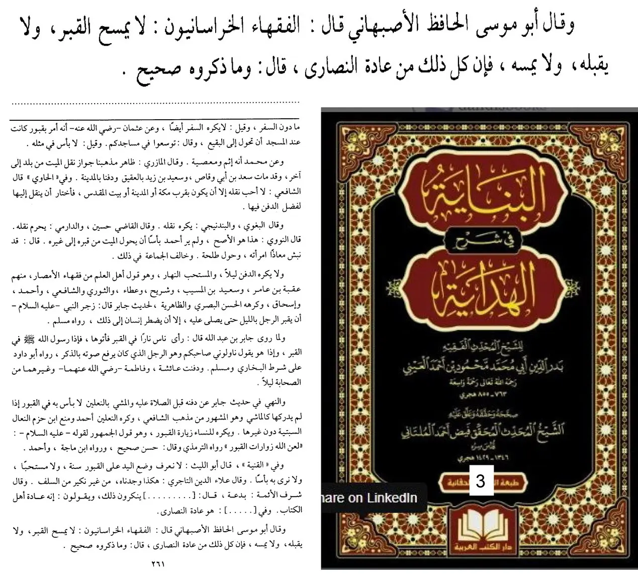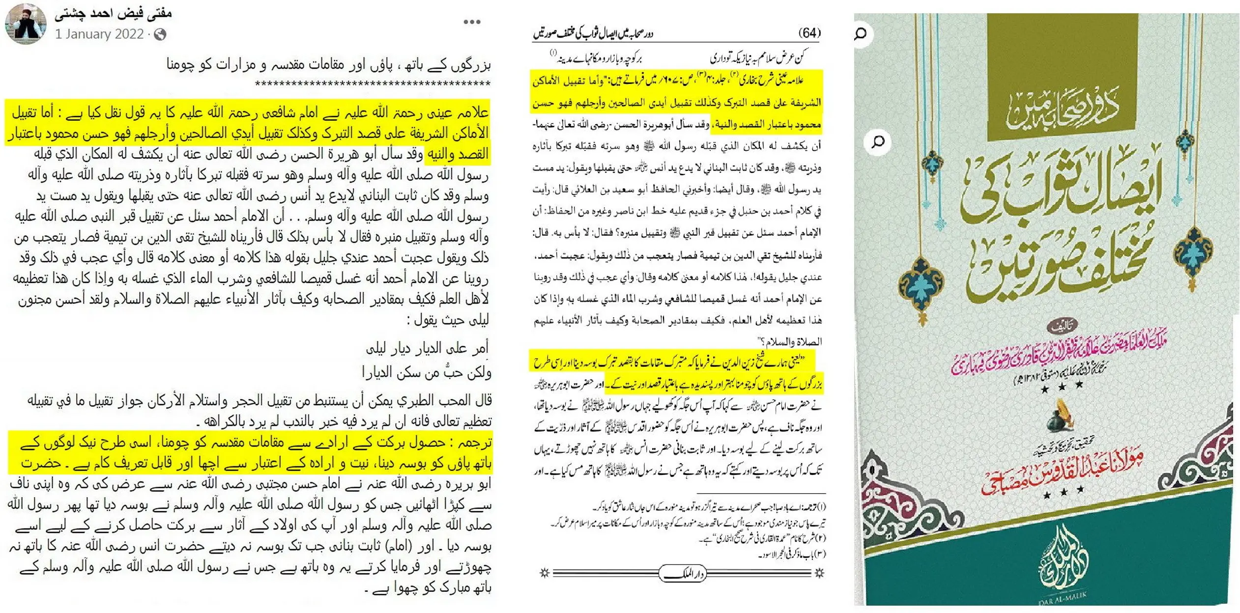 ❖ "امام شافعی رحمہ اللہ نے فرمایا: برکت کی نیت سے مقاماتِ مقدسہ کو بوسہ دینا اور صالحین کے ہاتھ پاؤں کو چومنا جائز ہے۔”