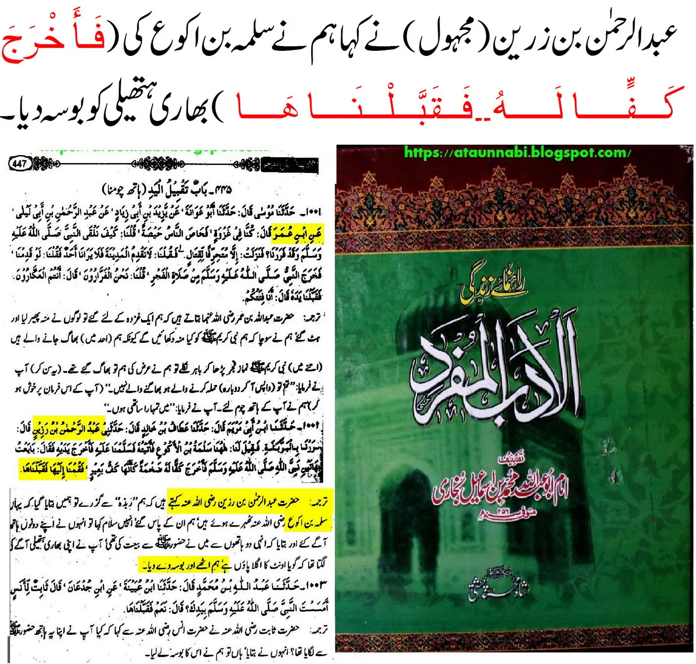 ❖ "عبدالرحمن بن رزین کہتے ہیں کہ ہم حضرت سلمہ بن الاکوع رضی اللہ عنہ کے پاس گئے، انہوں نے اپنے ہاتھ نکالے اور کہا: ان ہاتھوں سے میں نے رسول اللہ ﷺ کی بیعت کی تھی۔ پھر ہم نے ان کے ہاتھوں کو بوسہ دیا۔”