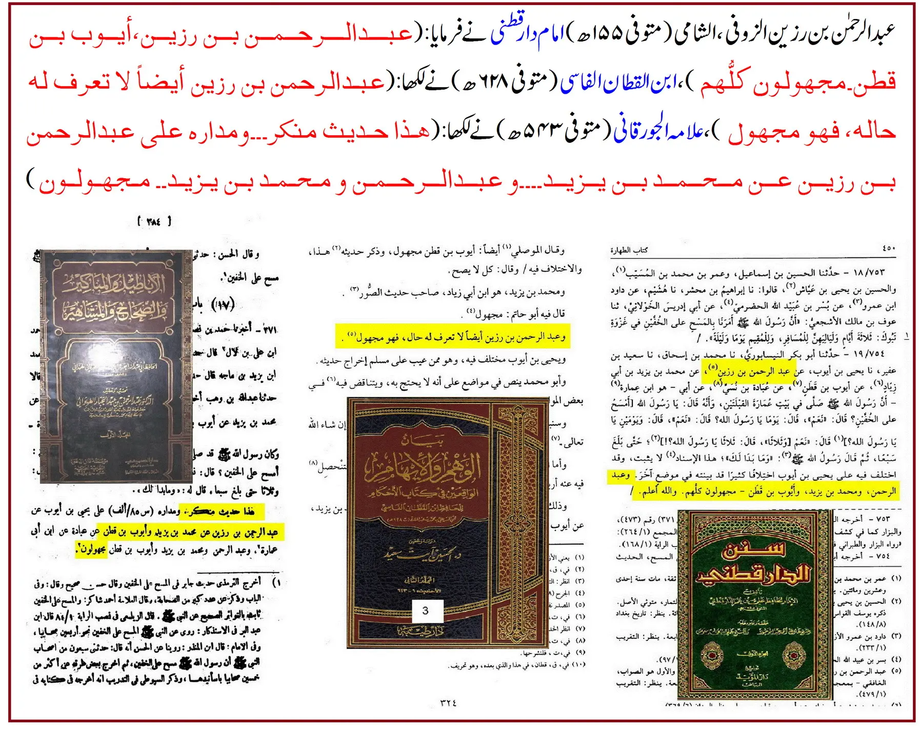 ③ امام دارقطنی: "عبد الرحمن بن رزين مجهول.”