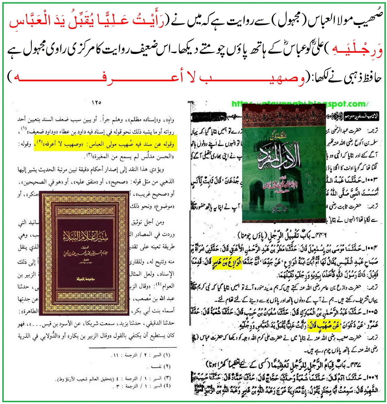 ① اس روایت میں راوی صہیب ہے، جو کہ حضرت عباس کا غلام تھا، لیکن محدثین نے لکھا ہے کہ وہ مجہول ہے۔