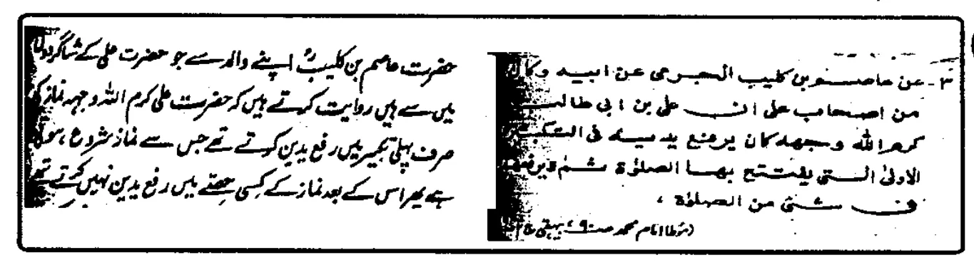 اقول: قاری ابوبکر بن عیاش کی اس روایت کو انوار خورشید صاحب نے نمبر 1 اور نمبر 2 نمبر4 تین دفعہ بیان کیا ہے جبکہ روایت ایک ہی ہے۔ ہمارے مکتبہ میں معرفتہ السنن والآثار کا جو نسخہ موجود ہے (ط دار الکتب العلمیہ بیروت لبنان) اس کی جلد نمبر 1 ص 556 پر یہ روایت موجود ہے۔ امام بیہقی نے اس پر امام بخاری کی جرح نقل کی ہے۔ امام بخاری کی یہ تحقیق ہے کہ ابوبکر بن عیاش نے یہ روایت اختلاط کے بعد بیان کی ہے۔ (ص 557 ایضا) امام ابن معین فرماتے ہیں کہ یہ روایت ابوبکر بن عیاش کا وہم ہے۔ اس کی کوئی اصل نہیں ہے۔ [جزء رفع الیدین ص 56 ح16]