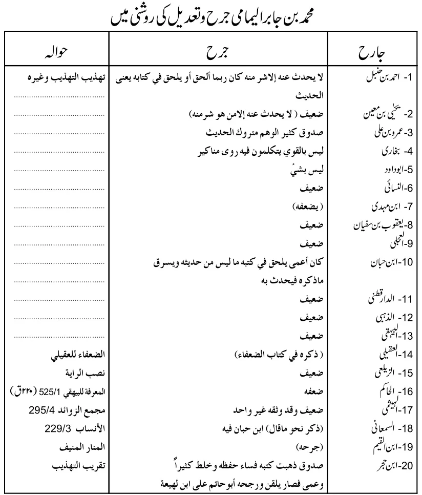 اس تفصیل سے معلوم ہوا کہ ائمہ مسلمین و مومنین کی عظیم اکثریت نے اسے اس کے برے حافظے، اختلاط اور تلقین گیری اور الحاق فی الکتب کی وجہ سے ضعیف و متروک قرار دیا ہے۔ انتہائی معتدل امام ابو زرعہ الرازی نے کہا: محمد بن جابر ساقط الحديث عند أهل العلم علماء کے نزدیک محمد بن جابر ساقط الحدیث ہے۔ (الجرح والتعدیل 220/7)