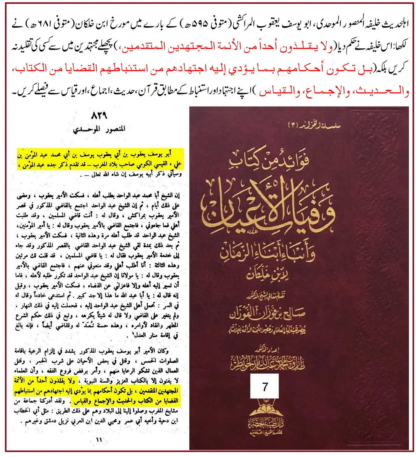 ① خلیفہ ابو یوسف یعقوب المراکشی نے تقلید کی نفی کی اور حکم دیا کہ صرف قرآن و سنت کے مطابق فتاویٰ دیے جائیں۔