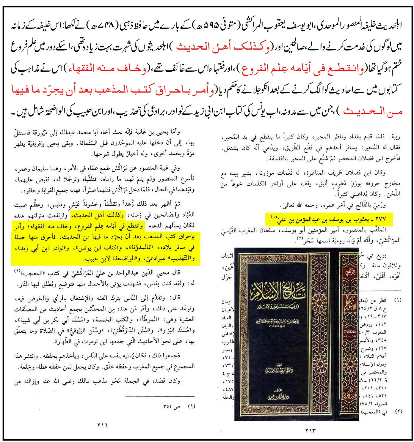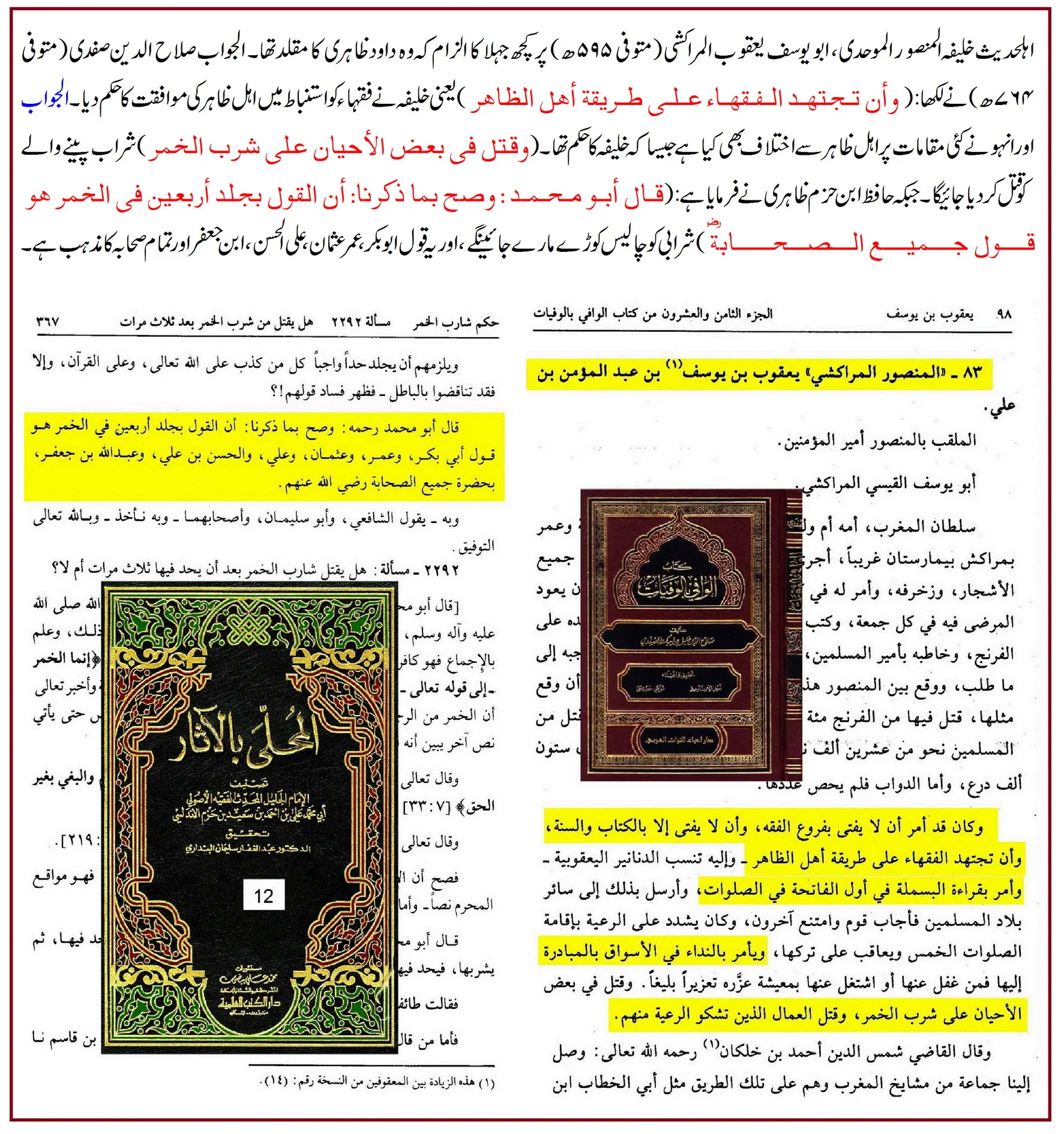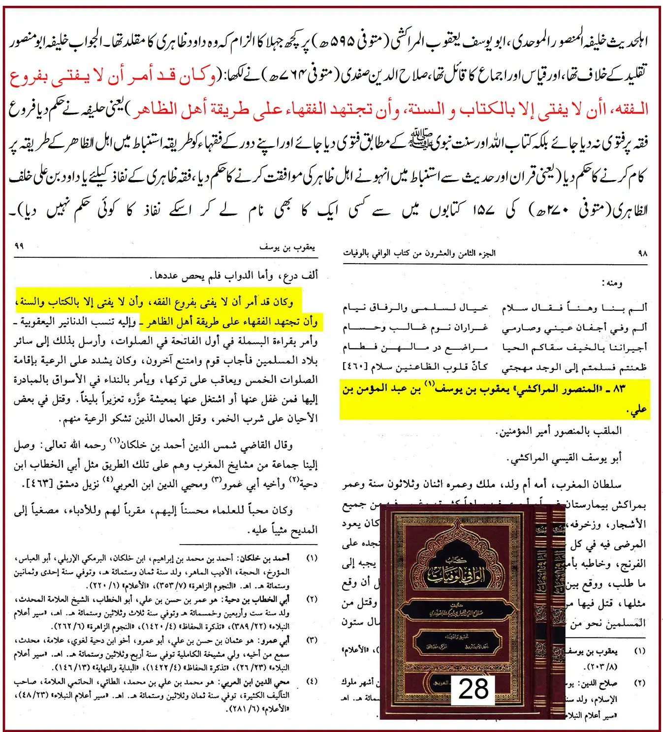 «83 – الْمَنْصُور المراكشي يَعْقُوب بن يُوسُف بن عبد الْمُؤمن بن عَليّ الملقب بالمنصور أَمِير الْمُؤمنِينَ … وَكَانَ قد أَمر أَن لَا يُفْتى بِفُرُوع الْفِقْه، وَأَن لَا يُفْتى إِلَّا بِالْكتاب وَالسُّنَّة، وَأَن تجتهد الْفُقَهَاء على طَريقَة أهل الظَّاهِر»