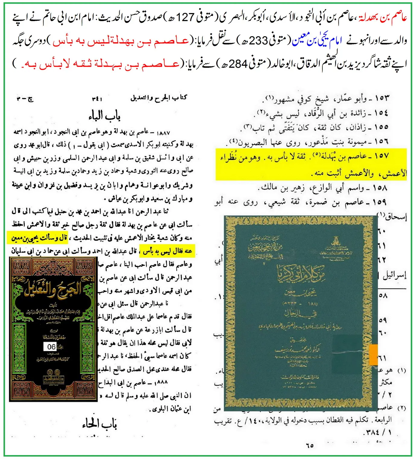 157 – عَاصِمُ بْنُ بَهْدَلَةَ ثِقَةٌ لَا بَأْسَ بِهِ، وَهُوَ مِنْ نُظَرَاءِ الْأَعْمَشِ، وَالْأَعْمَشُ أَثْبَتُ مِنْهُ.