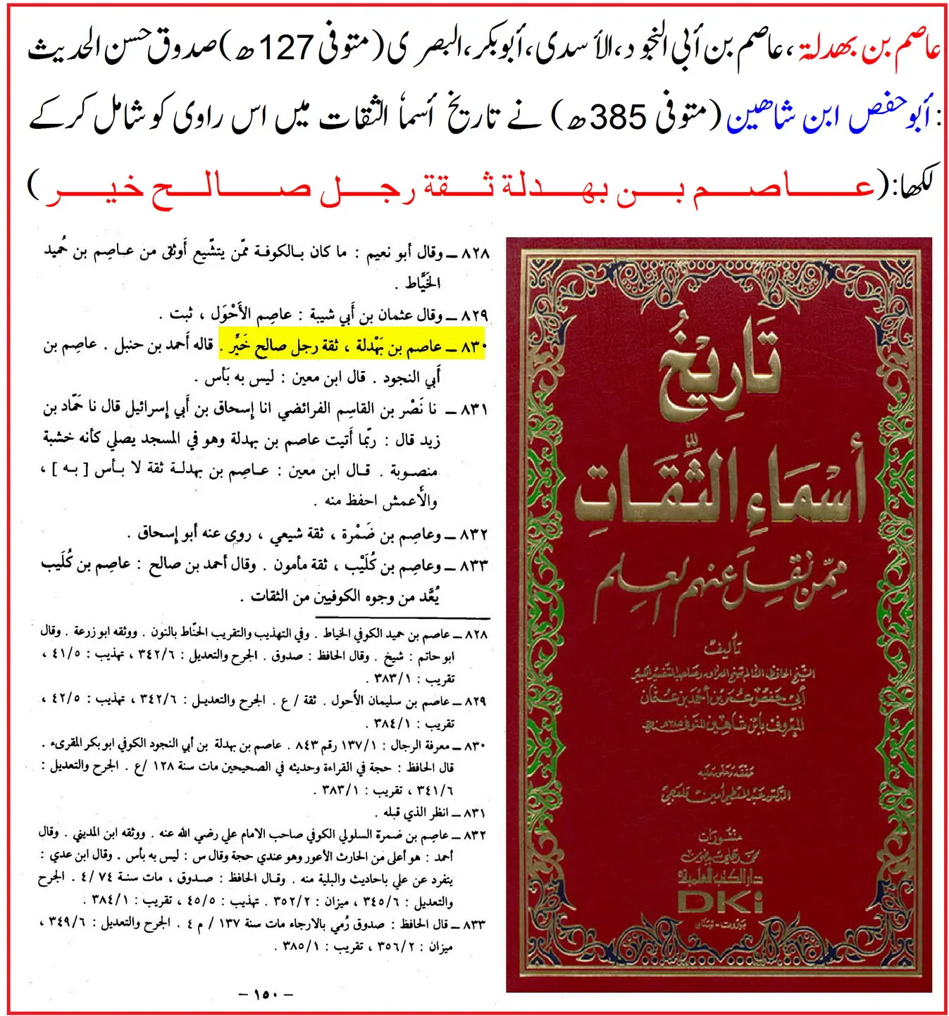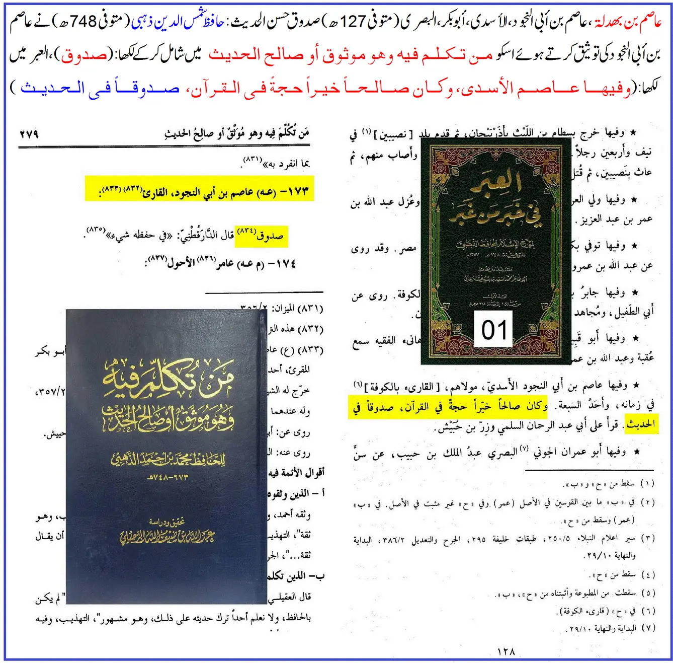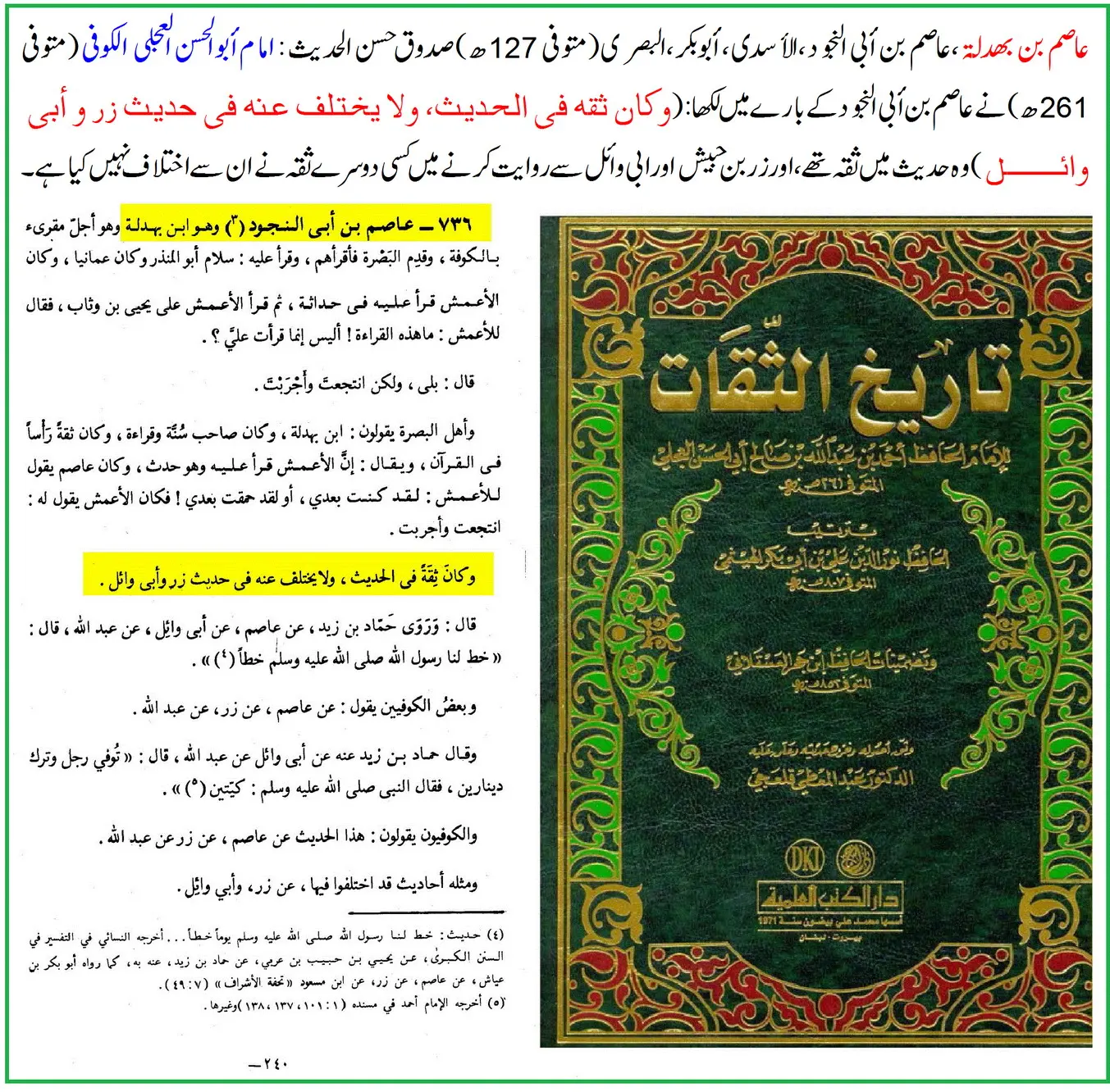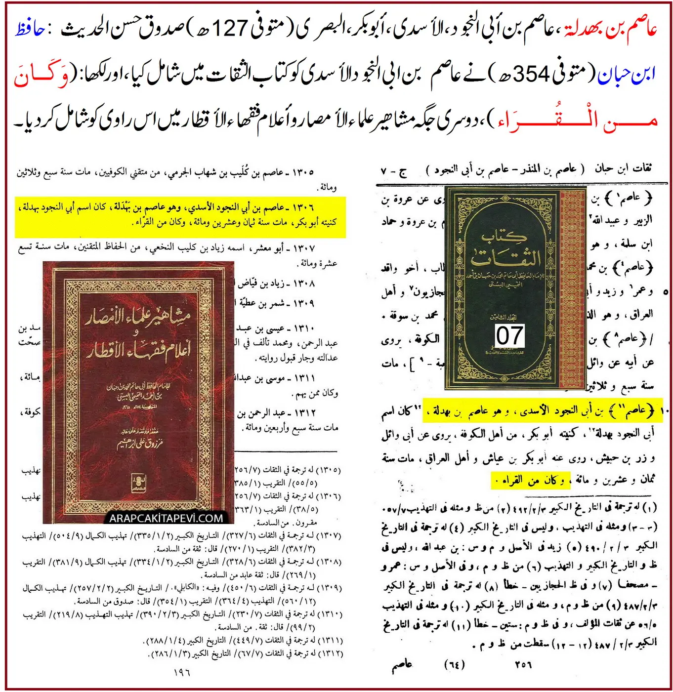 ترجمہ: عاصم بن ابی النجود، وہی ابن بہدلہ ہیں … “وہ حدیث میں ثقہ تھے؛ اور زر بن حبیش و ابو وائل سے ان کی روایت میں اختلاف نہیں کیا جاتا۔”