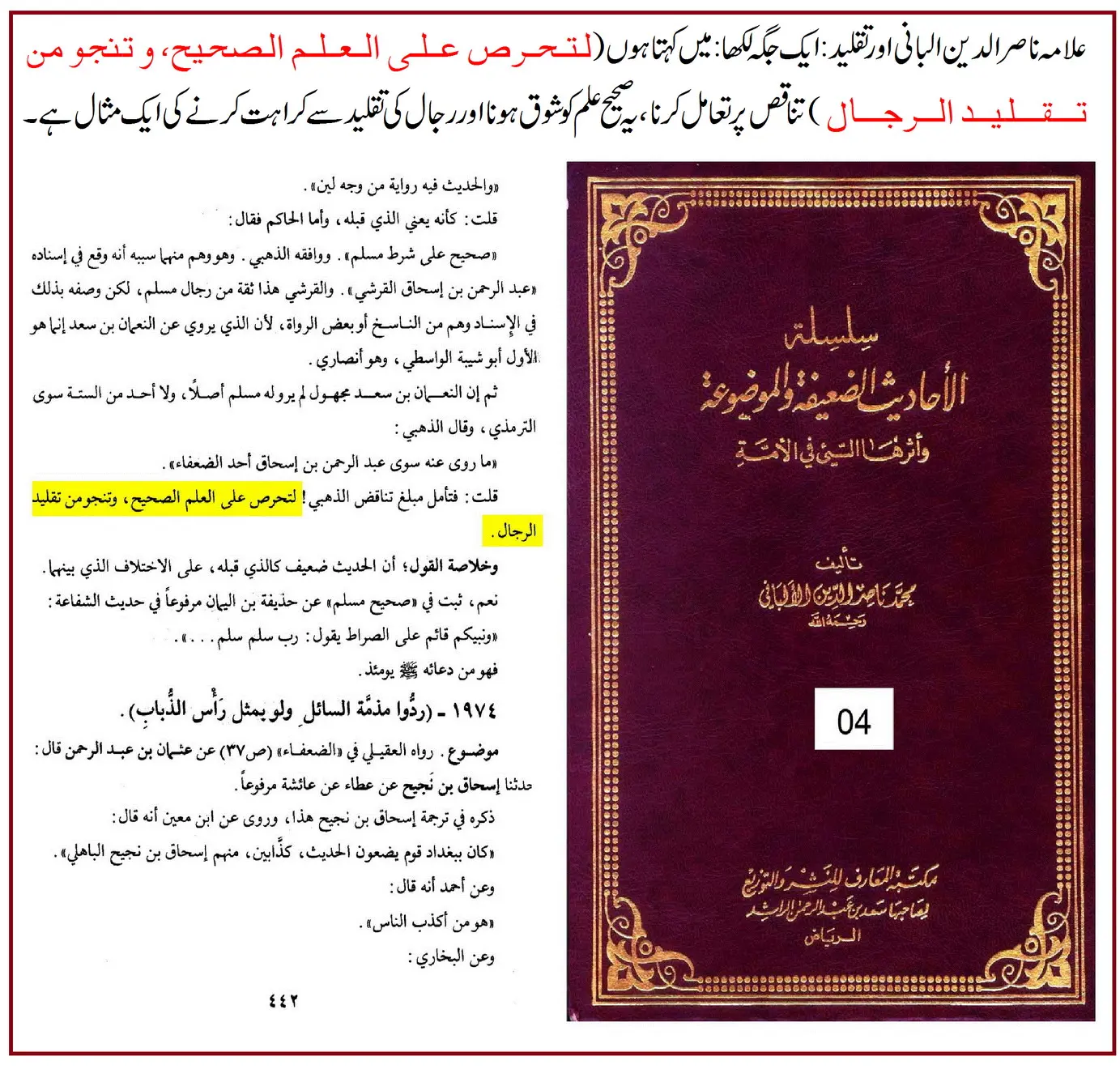 ❀ اصل مصادر سے اقتباسات کے ذریعے یہ دکھانا کہ البانیؒ تقلیدِ شخصی کو نہ صرف رد کرتے تھے بلکہ اسے دین سے خارج سمجھتے تھے۔