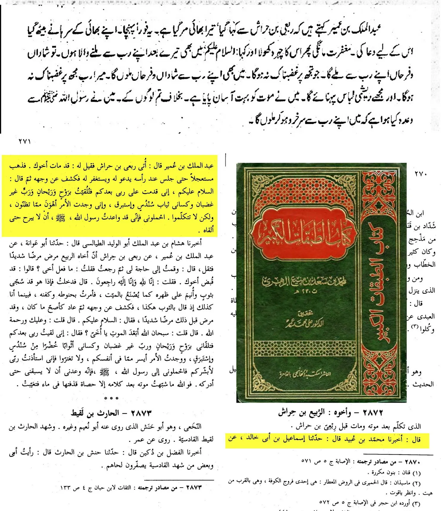 ابن سعد نے بیان کیا: ربعی بن خراش کو کہا گیا تیرا بھائی مر گیا ہے، وہ جلدی سے پہنچا، بھائی کے سرہانے بیٹھ گیا اور دعا و استغفار کرنے لگا۔ پھر اس نے چہرہ کھولا تو مردہ نے کہا: السلام علیکم۔ میں اپنے رب سے ملا، میرے رب نے مجھ سے خوش ہو کر ملاقات کی، مجھے ریشمی لباس پہنایا، معاملہ تمہارے خیال سے زیادہ آسان نکلا۔ مجھے اٹھاؤ کیونکہ میرا رسول اللہ ﷺ سے وعدہ ہے کہ ان سے ملاقات کروں گا۔