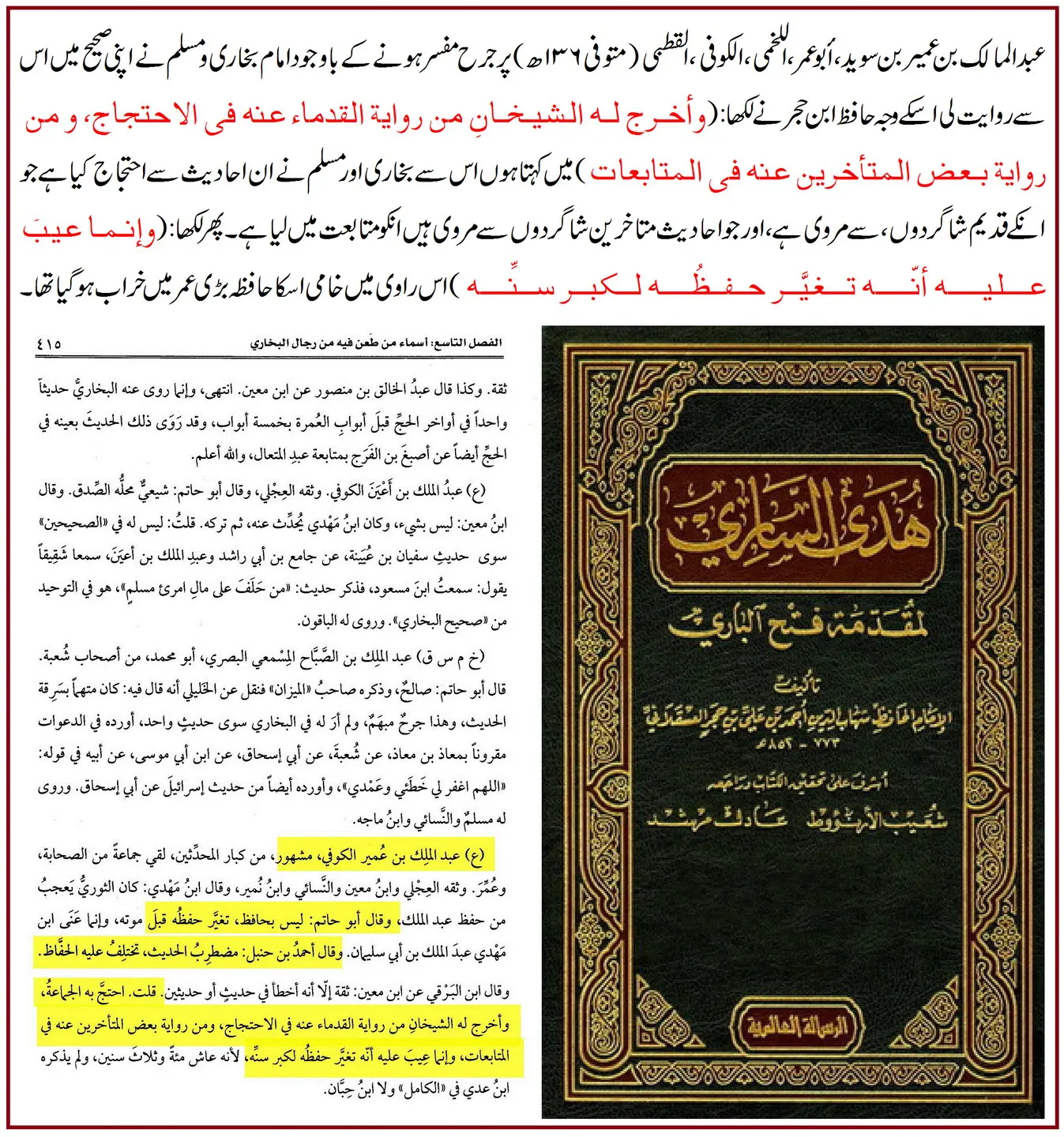 (فتح الباري 1/391)🔹 ترجمہ: بخاری و مسلم نے عبدالملک بن عمیر کی قدیم شاگردوں سے مروی احادیث کو احتجاج میں لیا ہے، اور اس کے متاخرین تلامذہ سے مروی احادیث کو صرف متابعات میں ذکر کیا ہے۔