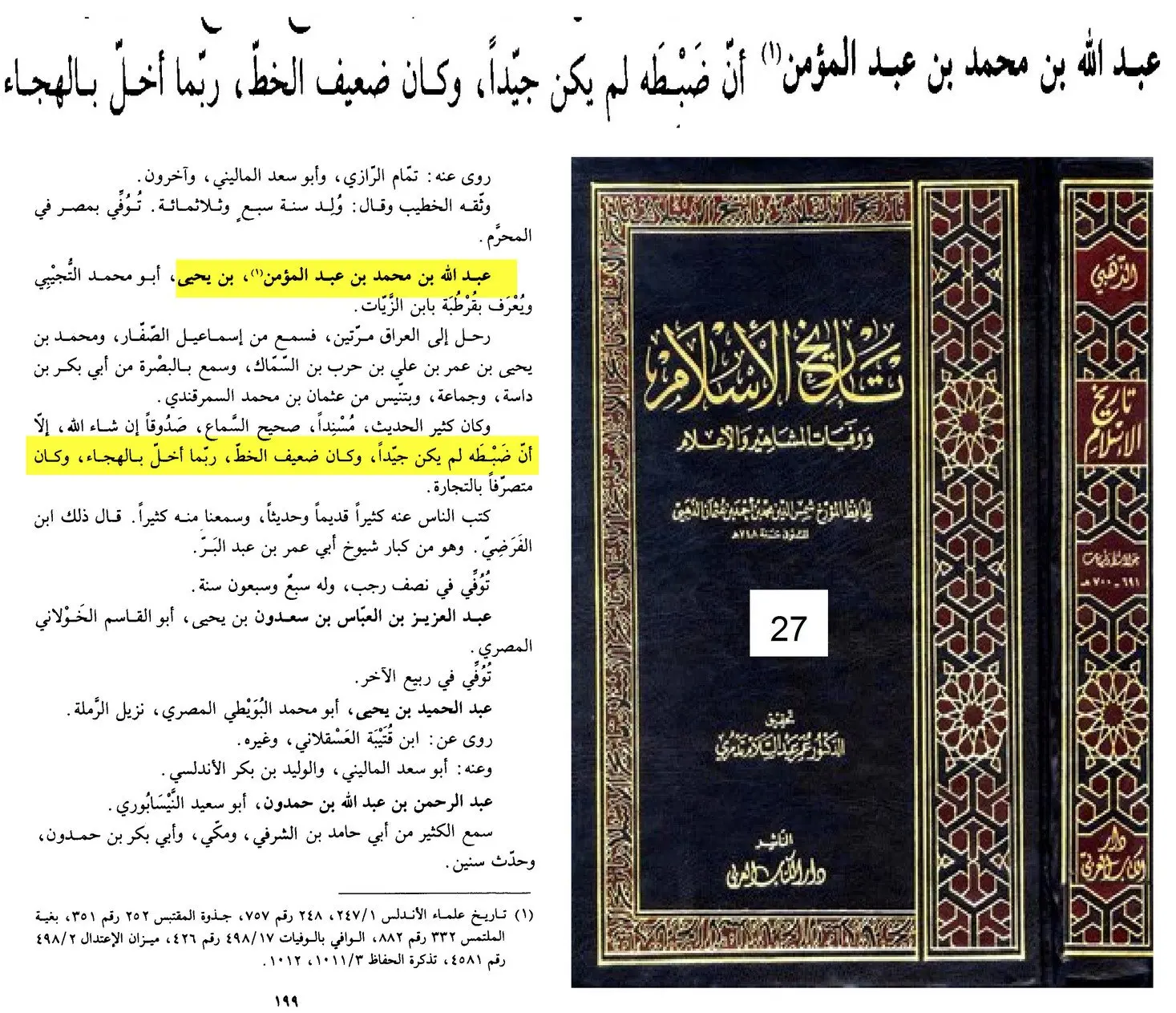 مولد: 314ھ، وفات: 390ھ (تاریخ علماء الأندلس لابن الفرضي 2/757) — ابن الفرضی نے کہا: «ضبطُه لم يكن جيداً، وكان ضعيفَ الخطّ، ربما أخلّ بالهجاء» (یعنی ضبط کمزور، کتابت میں غلطیاں)۔