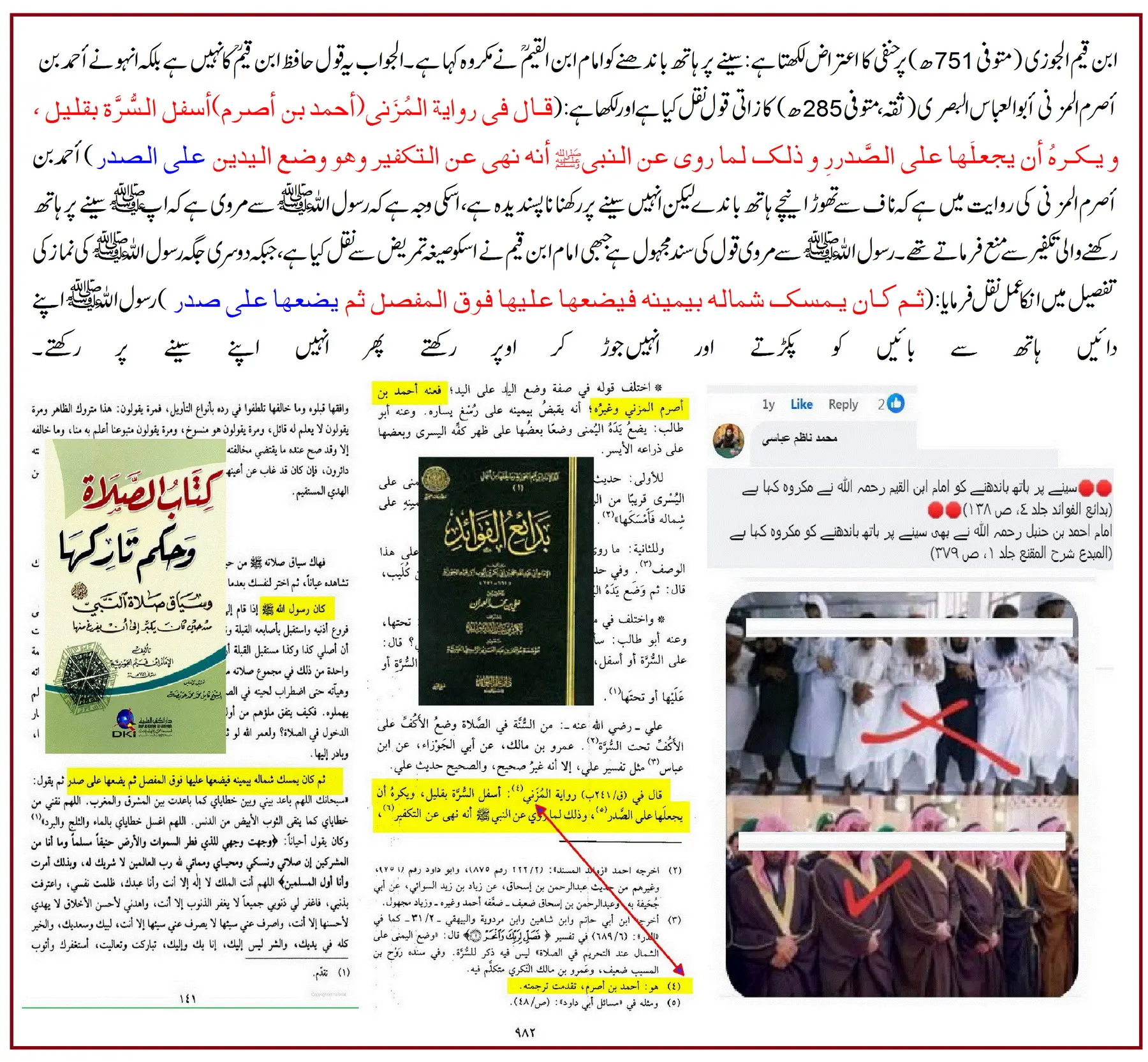 بعض حنفی مقلدین یہ دعویٰ کرتے ہیں کہ نماز میں سینے پر ہاتھ باندھنا غلط ہے، اور اس پر وہ امام ابن قیم الجوزیہؒ اور امام احمد بن حنبلؒ کے اقوال پیش کرتے ہیں، جن میں مبینہ طور پر اس عمل کو "مکروہ” کہا گیا ہے۔