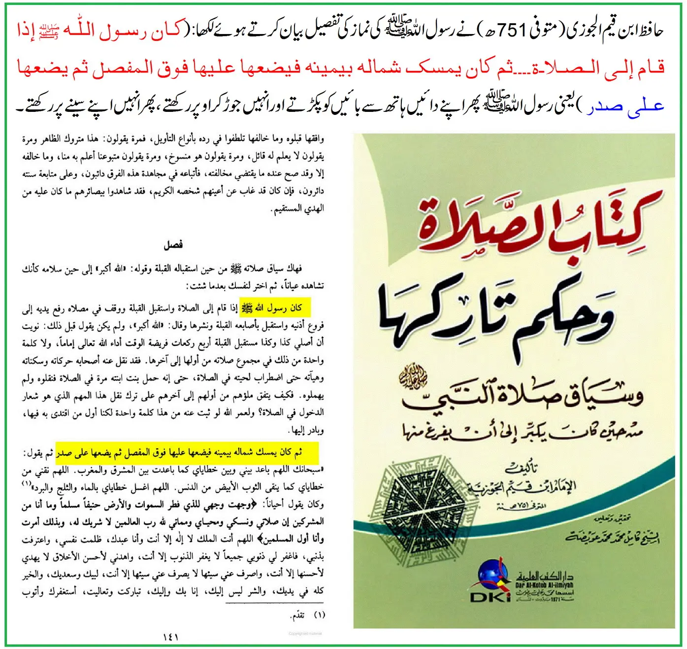 "أن لوضع الأيدى على الصدور في الصلاة أصلا أصيلا ودليلا جليلا، فلا ينبغى لأهل الإيمان الاستنكاف عنه، وكيف يستنكف المسلم عما ثبت عن رسول الله ﷺ”