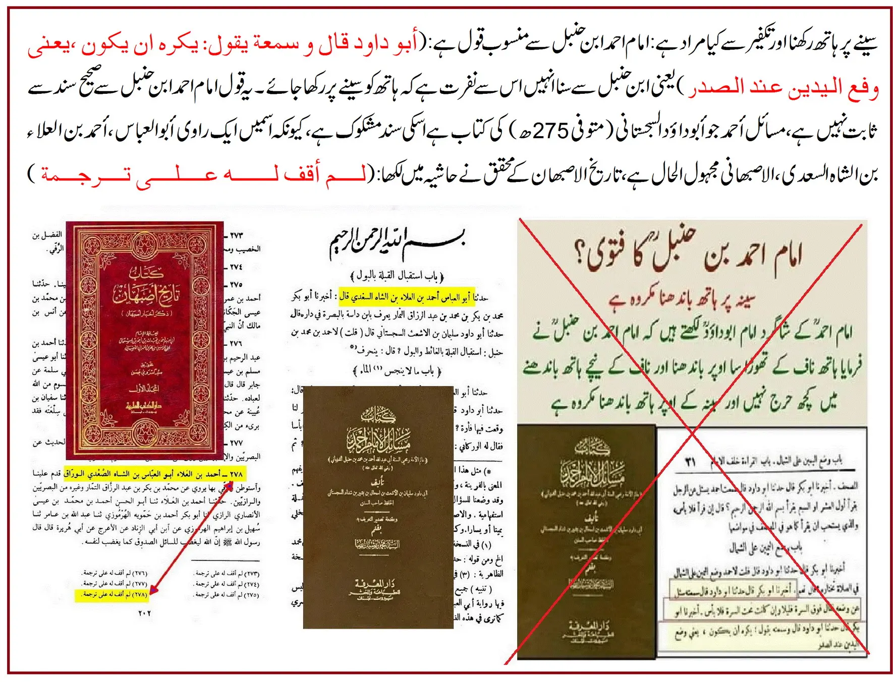 امام احمدؒ پر مکروہ کا قول سنداً ثابت نہیں، کیونکہ اس کی سند میں مجہول راوی موجود ہے۔ بیٹے عبداللہ بن احمدؒ کی روایت اور دیگر شواہد سے معلوم ہوتا ہے کہ وہ ناف کے اوپر، یعنی سینے کے قریب ہاتھ رکھتے تھے۔