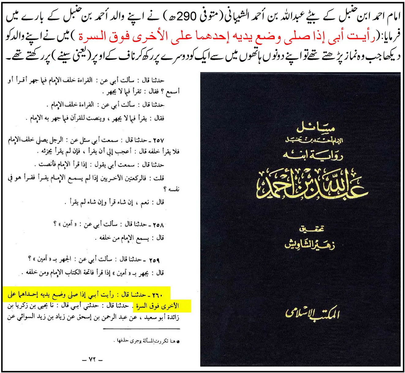 "میں نے اپنے والد (امام احمد) کو دیکھا کہ جب وہ نماز پڑھتے تو اپنے دونوں ہاتھوں میں سے ایک کو دوسرے پر ناف کے اوپر رکھتے تھے۔”