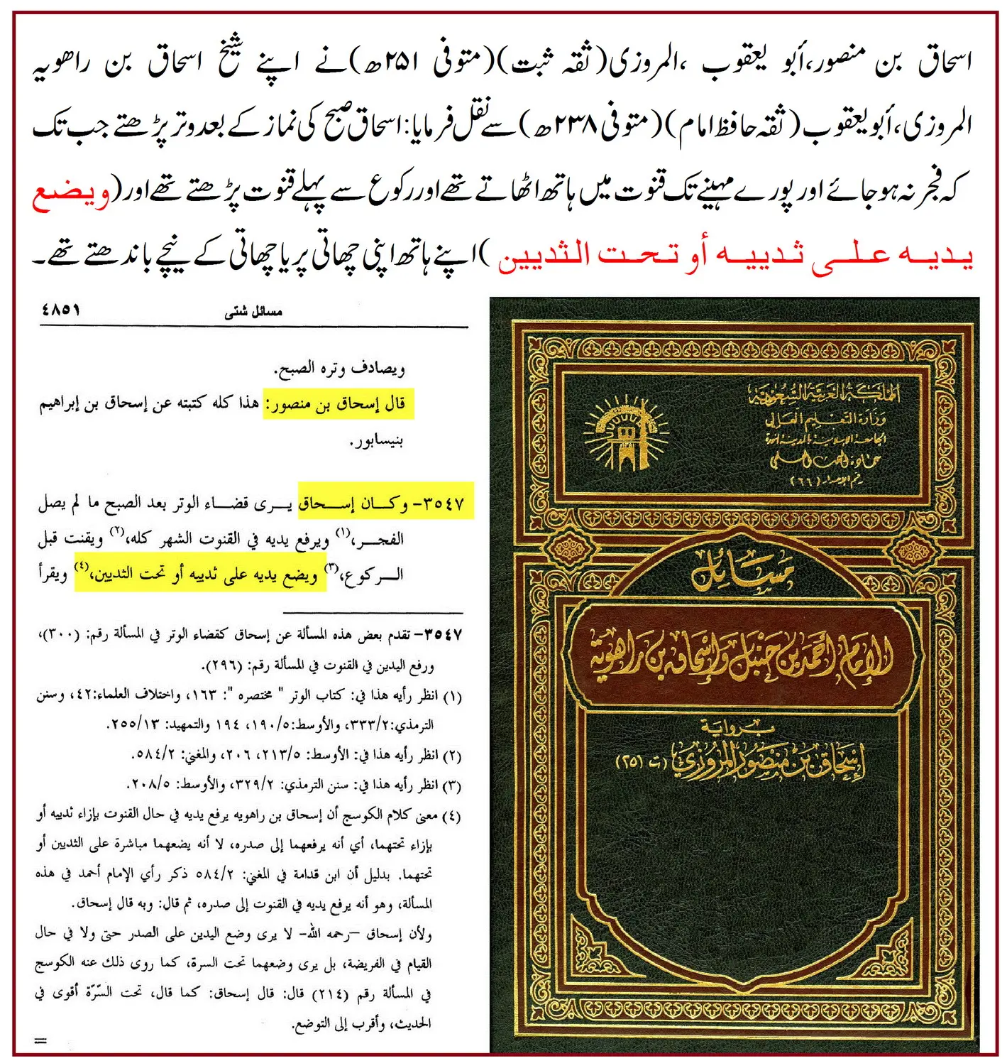 "اور وہ (امام اسحاق) اپنے ہاتھ اپنی چھاتی پر یا چھاتی کے نیچے رکھتے تھے۔”