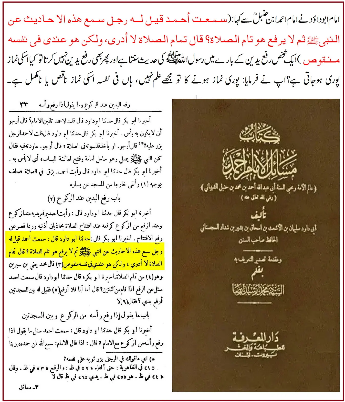 "سَمِعْتُ أَحْمَدَ، قِيلَ لَهُ: رَجُلٌ سَمِعَ هَذِهِ الْأَحَادِيثَ عَنِ النَّبِيِّ ﷺ، ثُمَّ لَا يَرْفَعُ، هُوَ تَامُّ الصَّلَاةِ؟ قَالَ: تَمَامُ الصَّلَاةِ لَا أَدْرِي، وَلَكِنْ هُوَ عِنْدِي فِي نَفْسِهِ مُنْقَصٌ غَرِّضٌ”