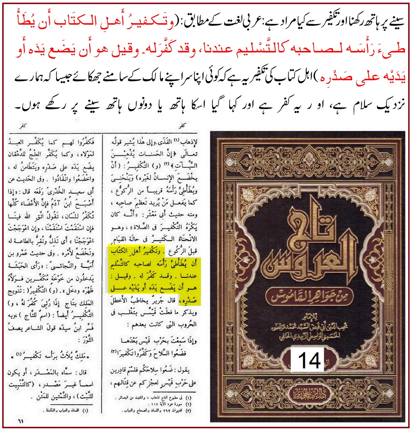 "اہل کتاب کی تکفیر یہ ہے کہ کوئی اپنے مالک کے سامنے اپنا سر جھکائے جیسے ہمارے ہاں سلام کیا جاتا ہے۔ اور کہا گیا کہ اس سے مراد یہ ہے کہ اپنا ہاتھ یا دونوں ہاتھ اپنے سینے پر رکھے۔”
