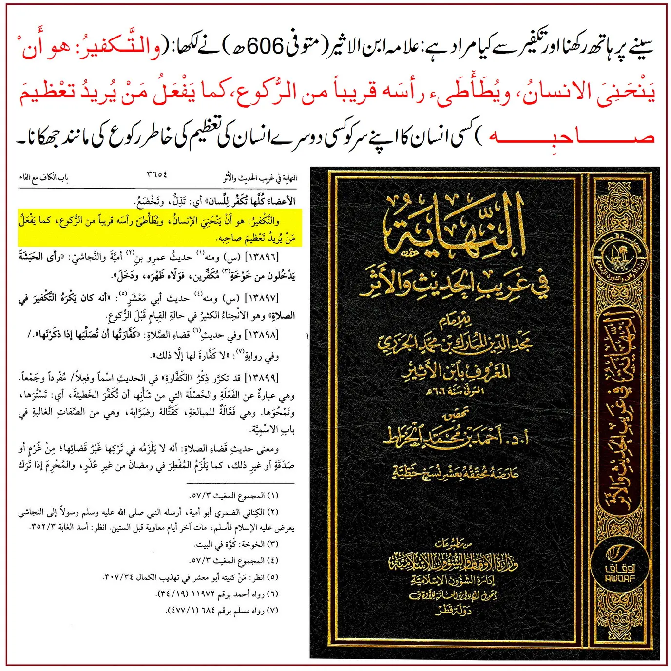 "تکفیر یہ ہے کہ آدمی رکوع کے قریب ہو کر اپنا سر جھکائے، جیسے کوئی اپنے ساتھی کی تعظیم کرنا چاہتا ہے۔”