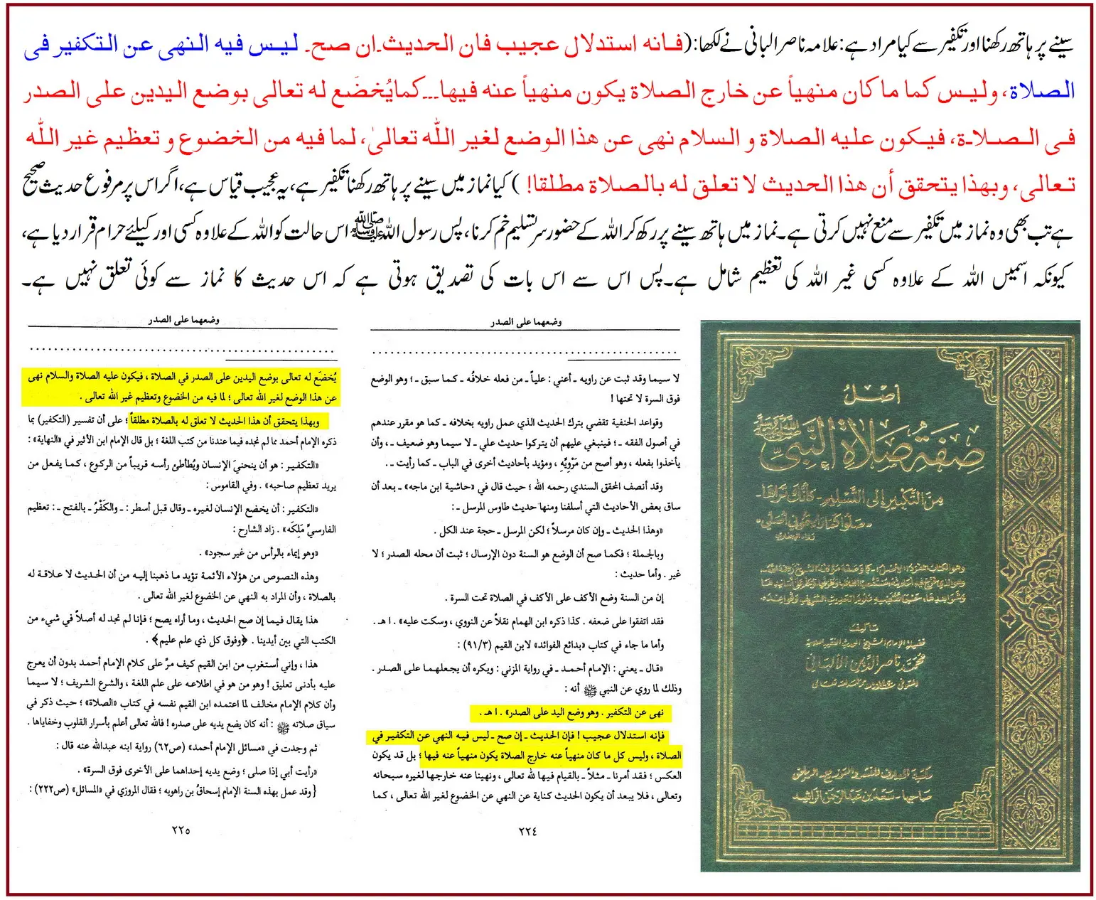 "تکفیر یعنی ہاتھ کو سینے پر رکھنا… اگر حدیث صحیح بھی ہو تب بھی اس میں نماز میں تکفیر سے ممانعت نہیں، بلکہ یہ ممانعت غیر اللہ کے لیے ہے؛ کیونکہ اس میں غیر اللہ کی تعظیم شامل ہے۔ اس سے ثابت ہوتا ہے کہ اس حدیث کا نماز سے کوئی تعلق نہیں۔”