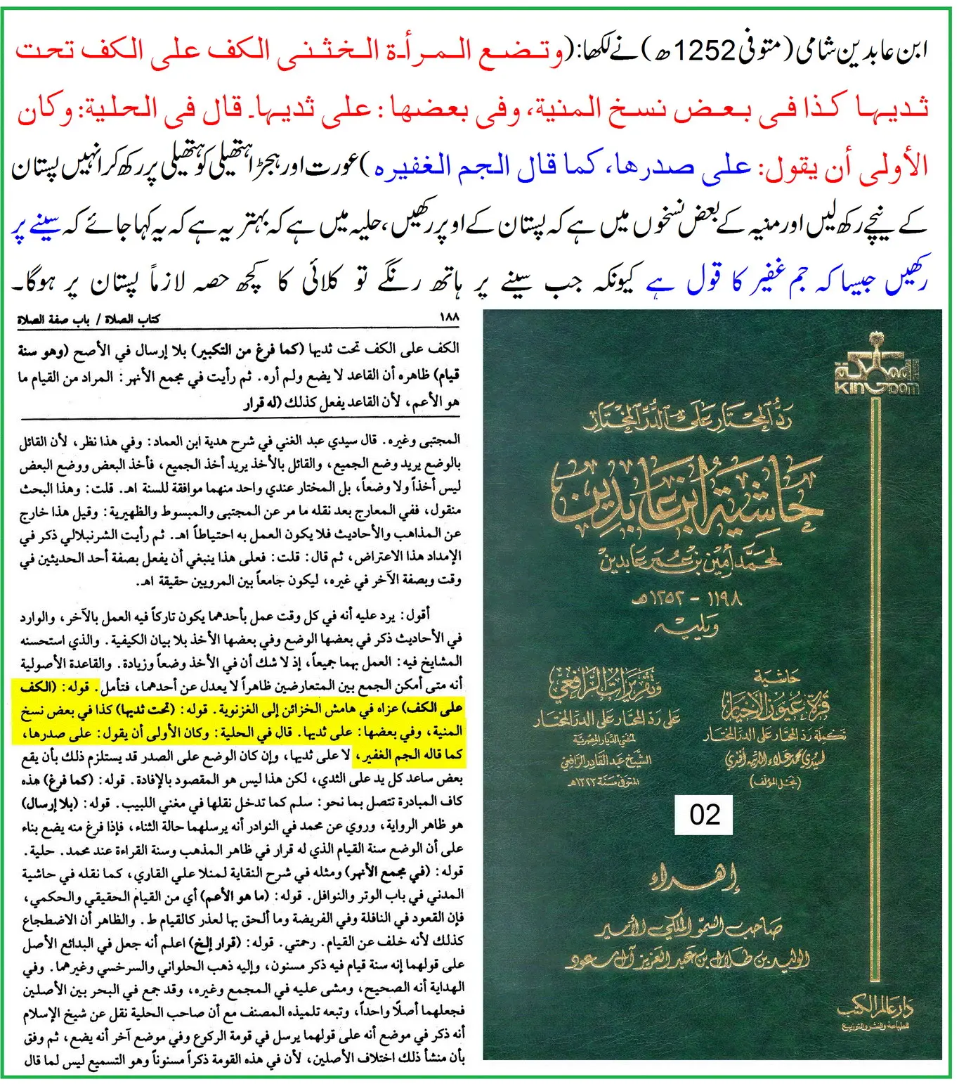 "عورت اور خنثی ہتھیلی کو ہتھیلی پر رکھ کر اپنے پستان کے نیچے رکھیں … بعض نسخوں میں ہے پستان پر رکھیں۔ ‘الحلیہ’ میں ہے: بہتر یہ ہے کہ کہا جائے سینے پر رکھیں جیسا کہ جم غفیر کا قول ہے، اگرچہ سینے پر رکھنے سے کبھی کلائی کا کچھ حصہ پستان پر آجاتا ہے۔”