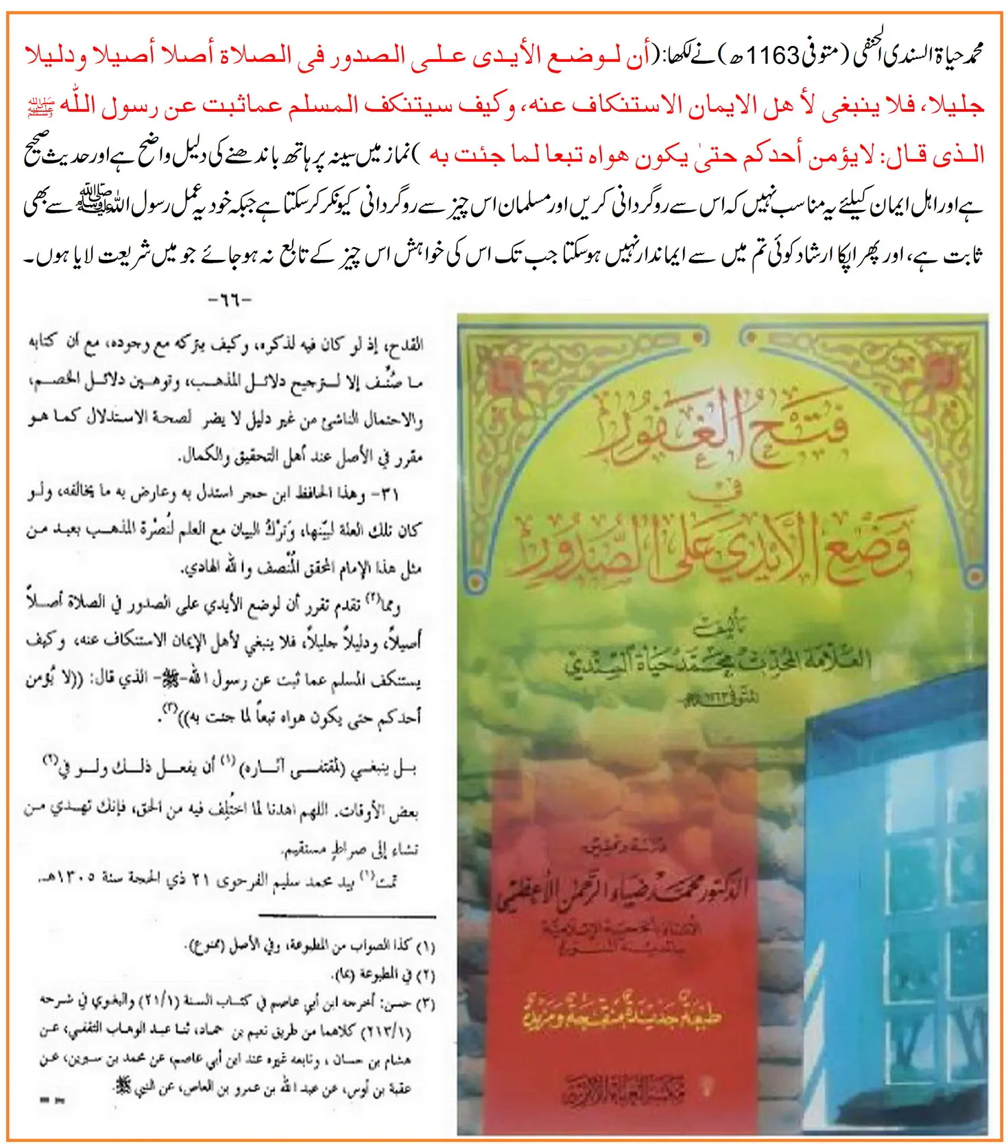 احناف کے اپنے اکابر علماء نے سینے پر ہاتھ رکھنے کو جائز بلکہ سنتِ نبوی ﷺ سے ثابت مانا ہے، جن میں علامہ ابن عابدین شامیؒ اور علامہ محمد حیات سندھیؒ شامل ہیں۔