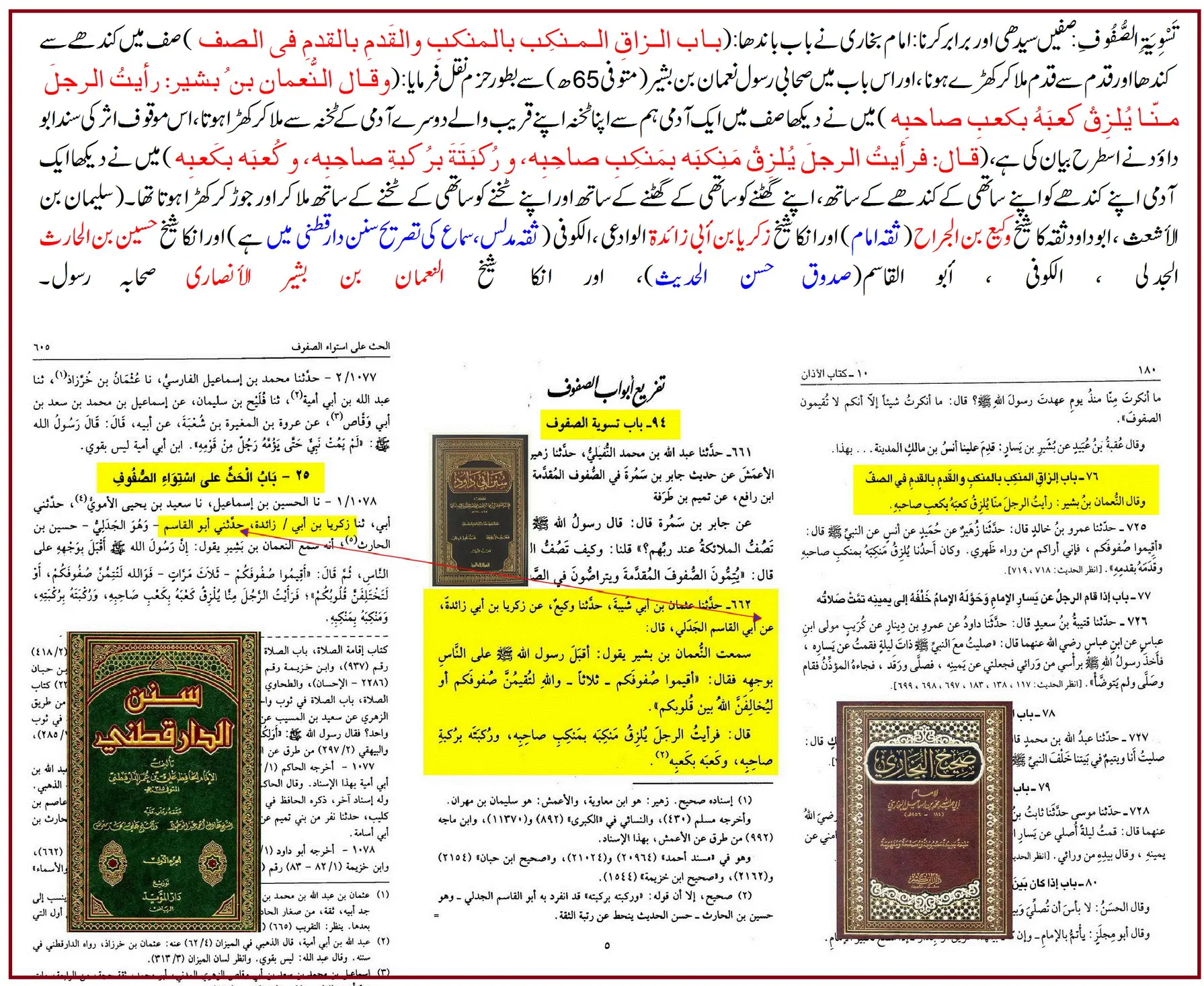 صف میں پاؤں سے پاؤں اور کندھے سے کندھا ملانے کا سب سے واضح بیان سیدنا نعمان بن بشیرؓ کی روایت میں ملتا ہے، جسے امام بخاریؒ اور امام ابو داودؒ نے صحیح سند سے نقل کیا ہے۔