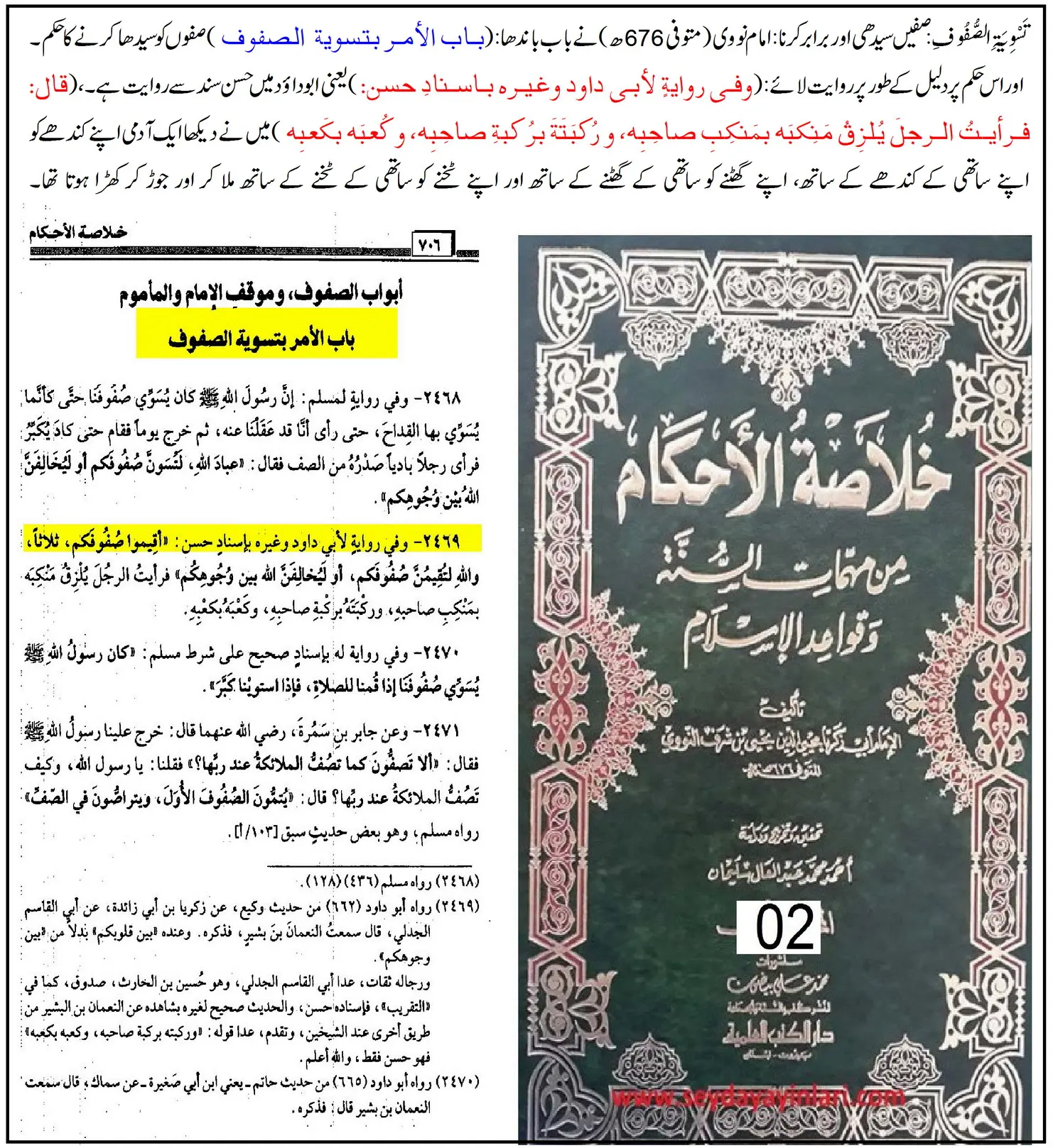 خلاصة الأحكام میں باب ”صفوں کو سیدھا کرنے کا حکم“ میں یہی روایت ذکر کی اور فرمایا: