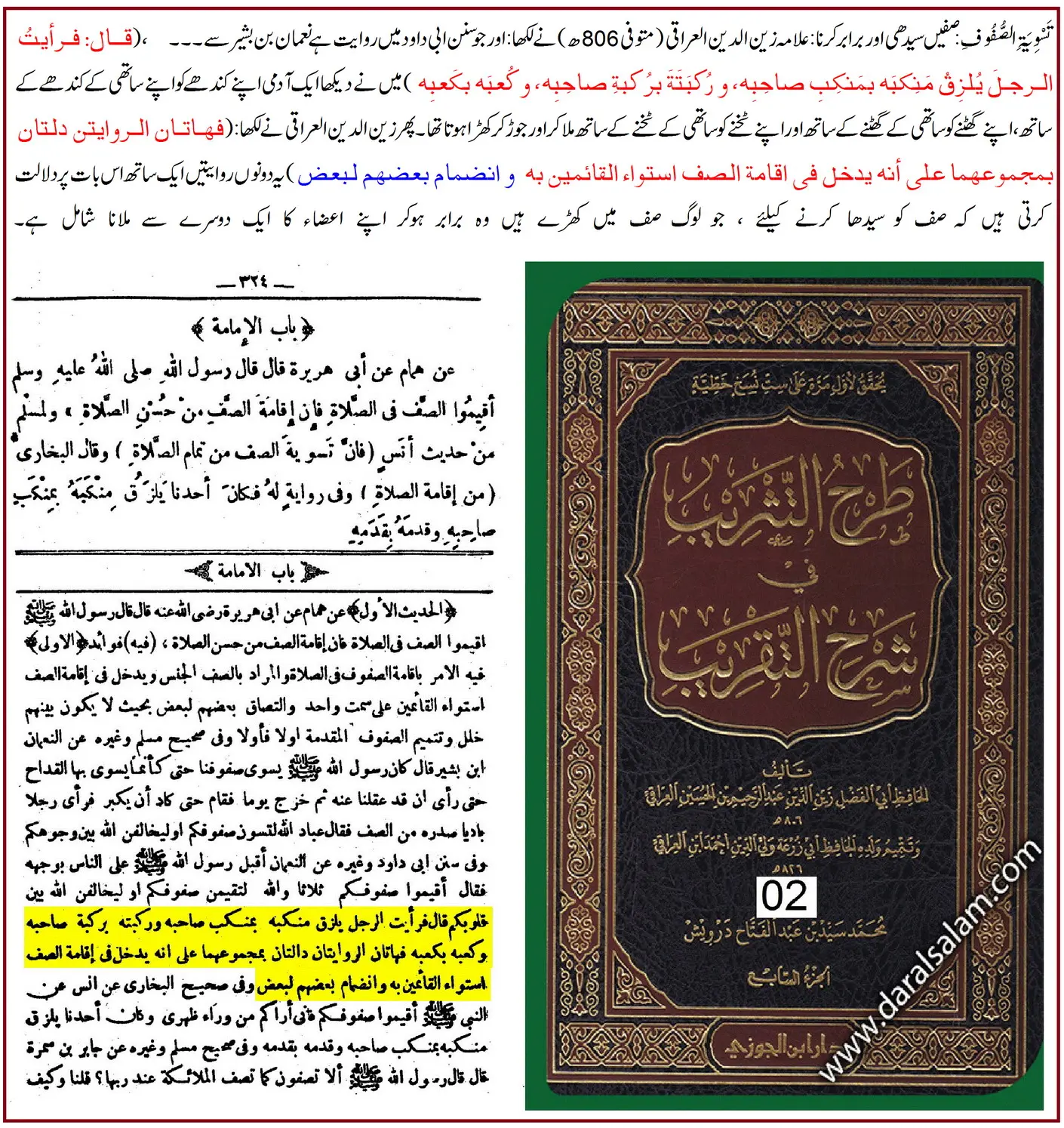 ”صف میں کندھے سے کندھا اور قدم سے قدم ملا کر کھڑے ہونے کا بیان۔“