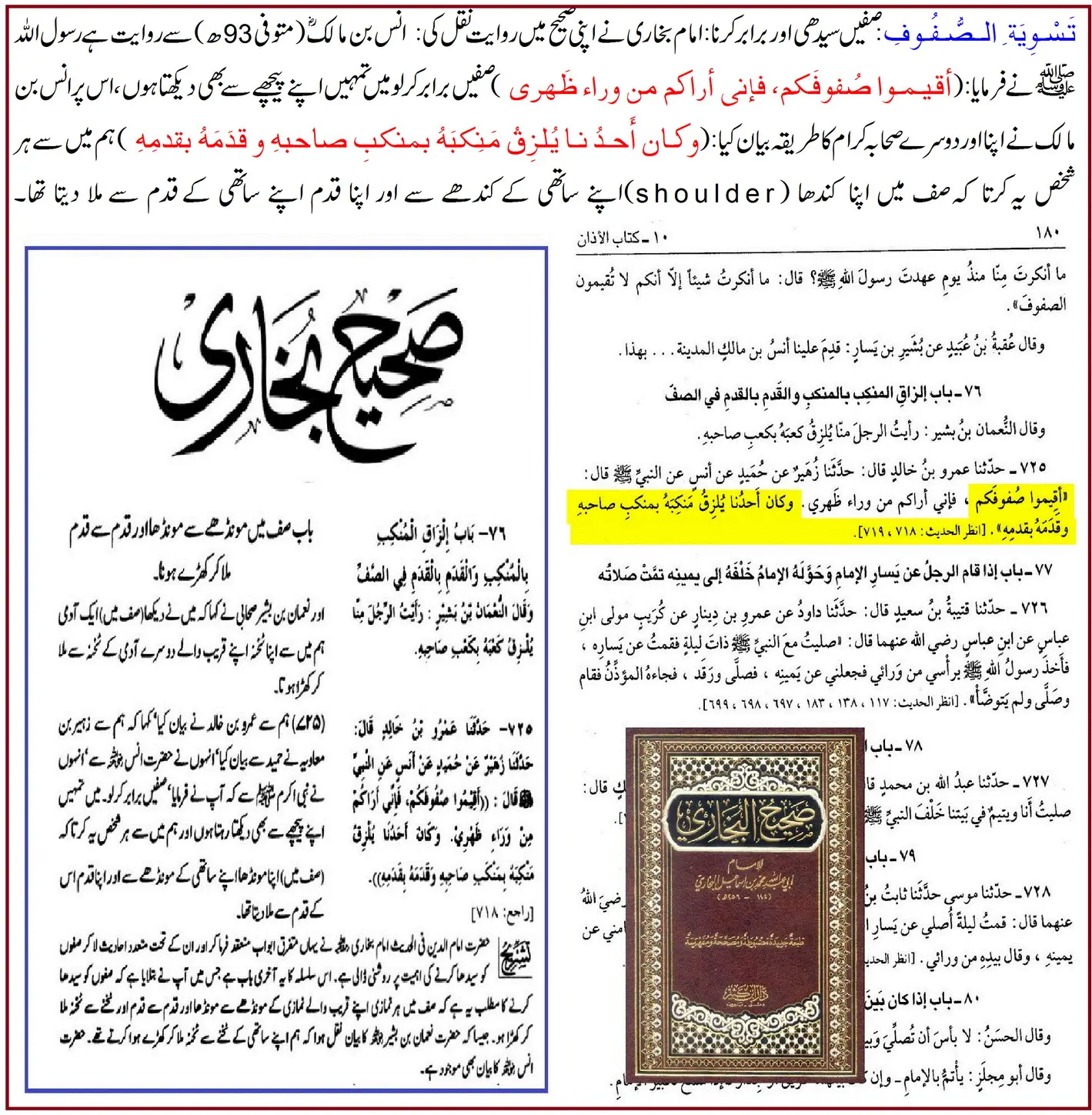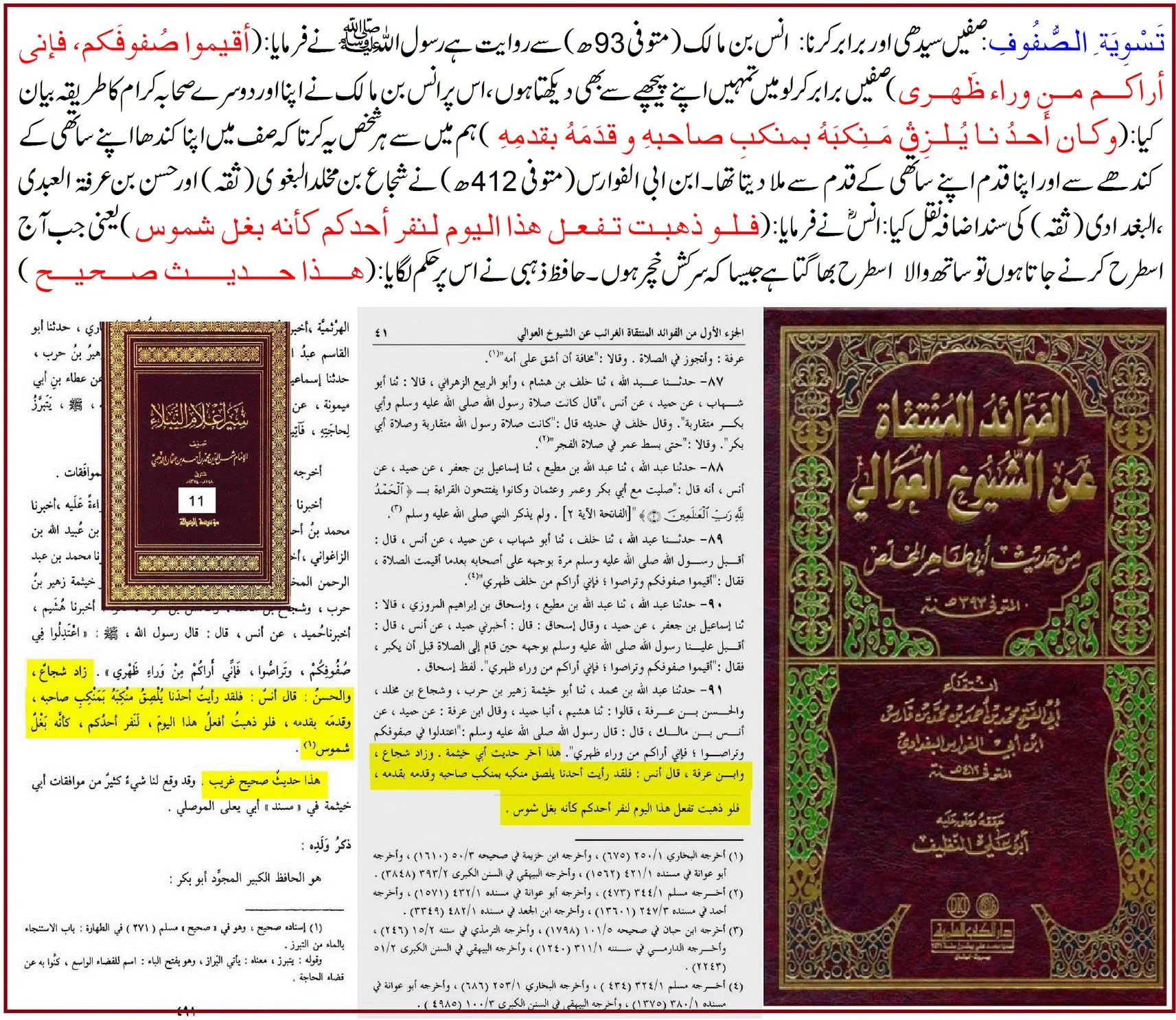 صف میں پاؤں سے پاؤں اور کندھے سے کندھا ملانے کا عملی نمونہ سیدنا انس بن مالکؓ کی روایت میں بھی ملتا ہے، جسے امام بخاریؒ، ابن ابی شیبہؒ اور دیگر محدثین نے صحیح سند کے ساتھ بیان کیا ہے۔