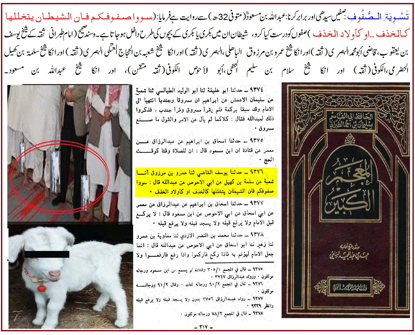 ”اپنی صفوں کو درست کرو، کیونکہ شیطان ان میں اس طرح گھس جاتا ہے جیسے بکری یا بکری کا بچہ۔“