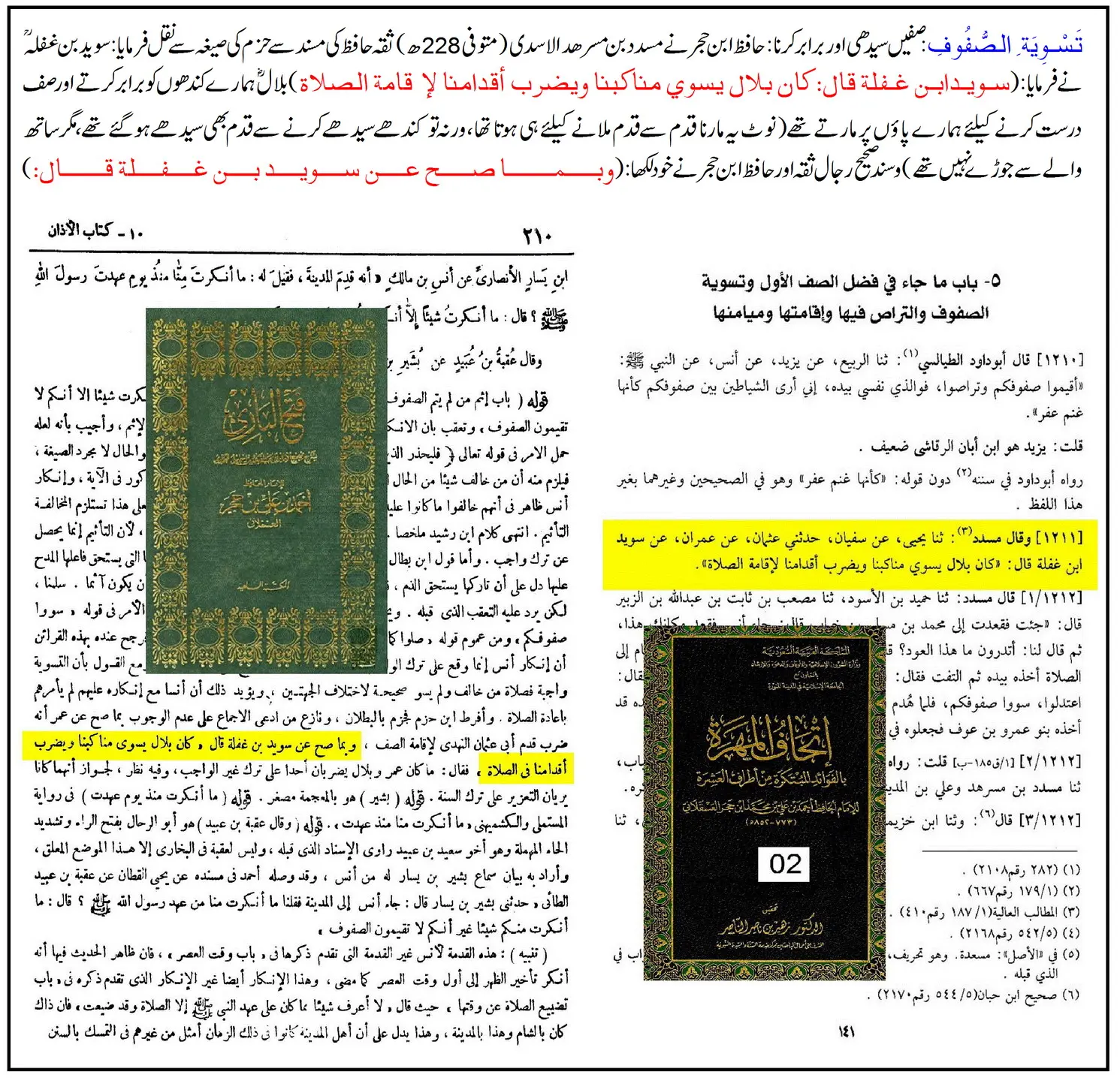 «صَحَّ عَنْ سُوَيْدِ بْنِ غَفْلَةَ قَالَ: كَانَ بِلَالٌ يُسَوِّي مَنَاكِبَنَا وَيَضْرِبُ أَقْدَامَنَا فِي الصَّلَاةِ»